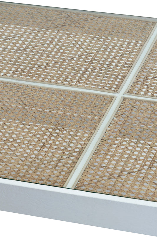 Simple and classic rectangular shape constructed in white finish mango wood. The Rita coffee table features a natural rattan underlay with glass top.