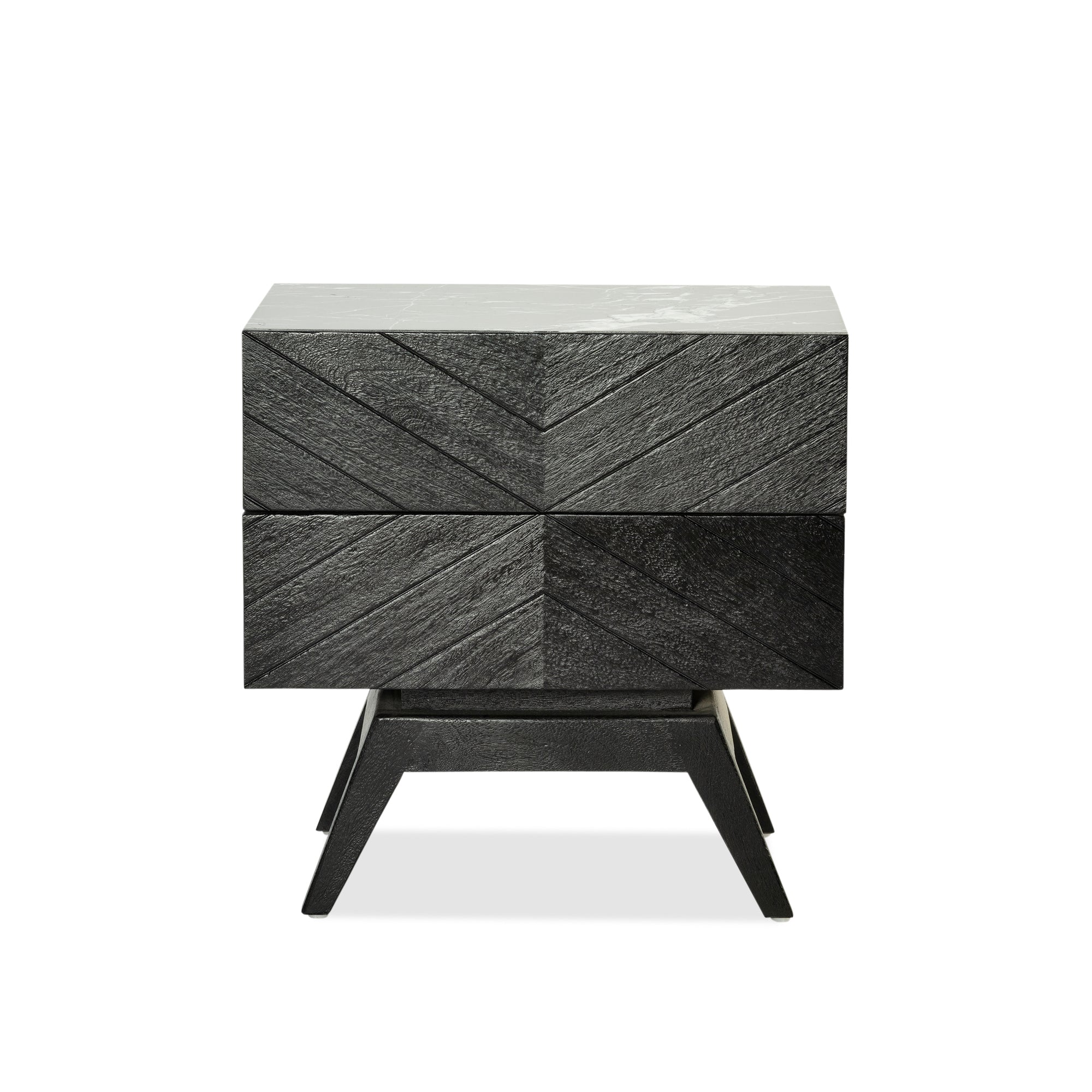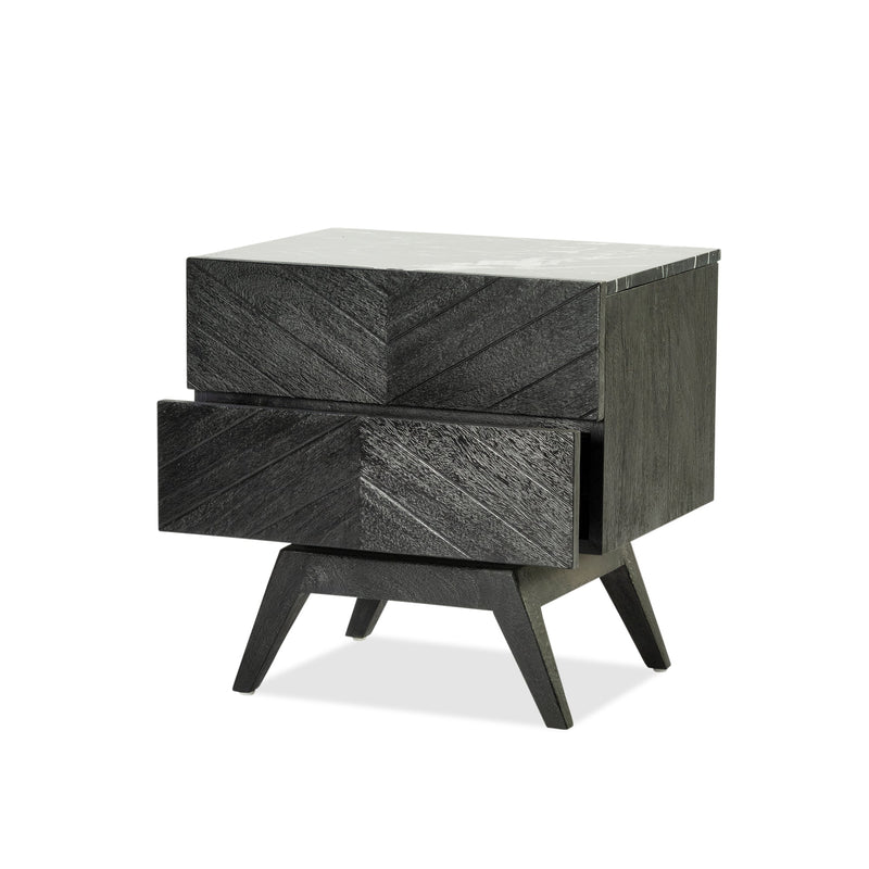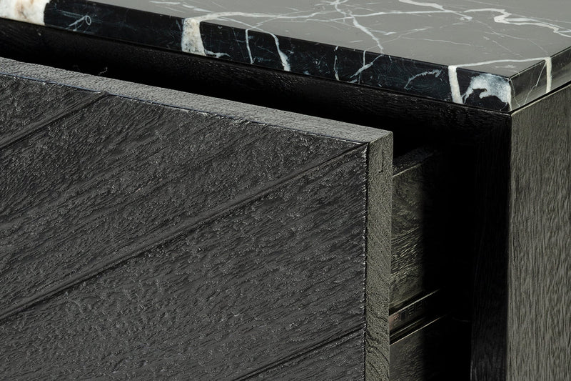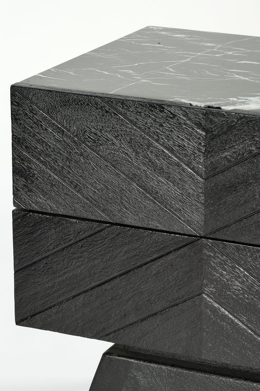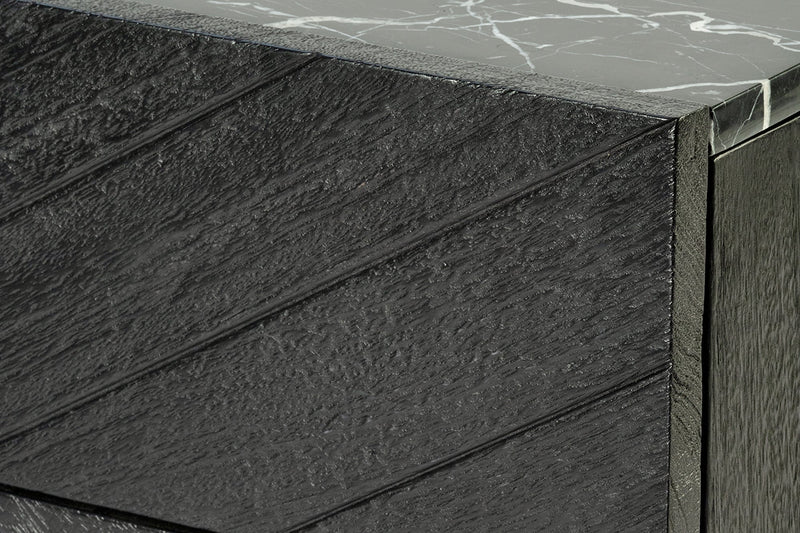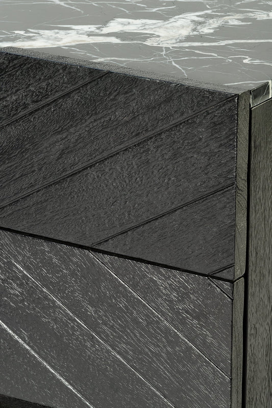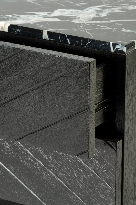 Made from mango wood in black finish and solid Carrara black marble top. Two large sliding drawers with studio carving detail on front.