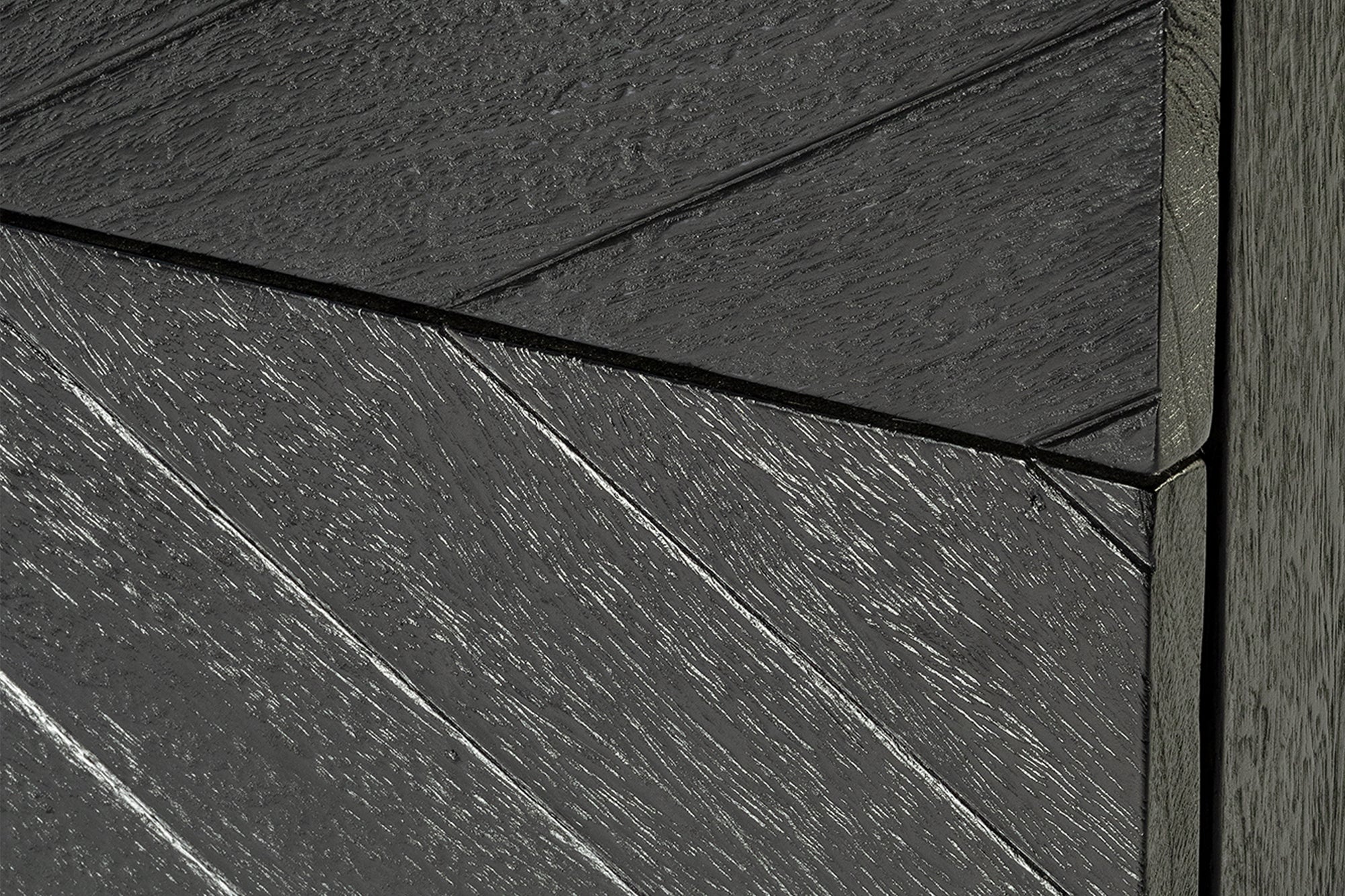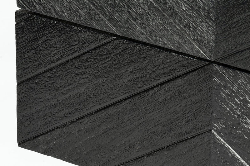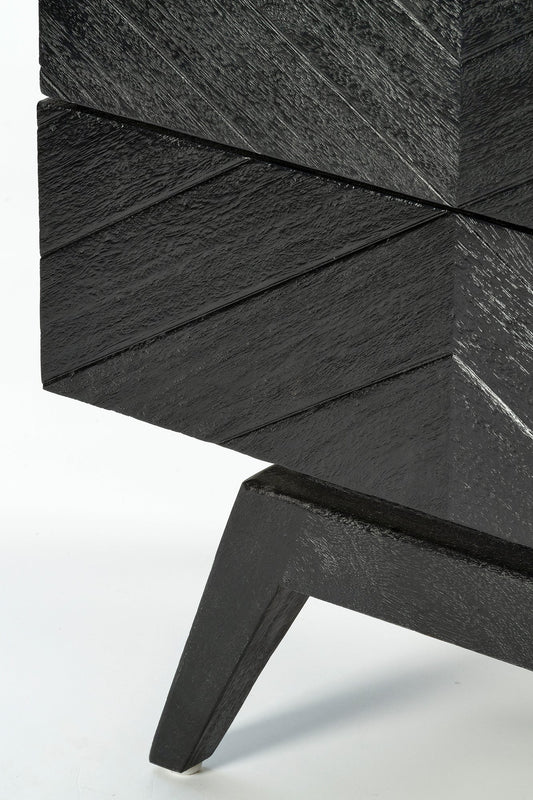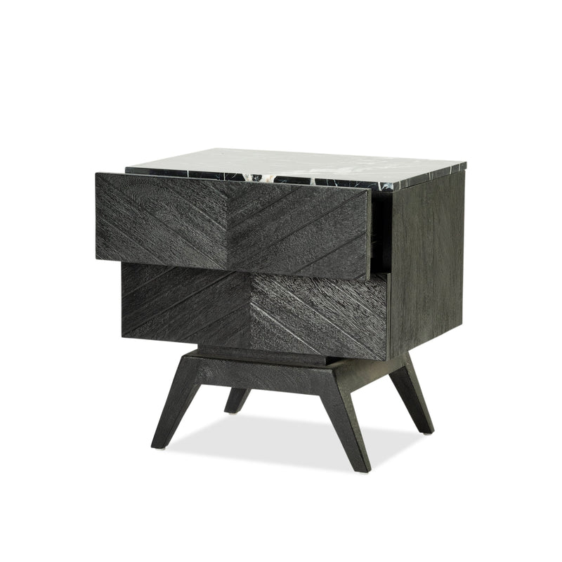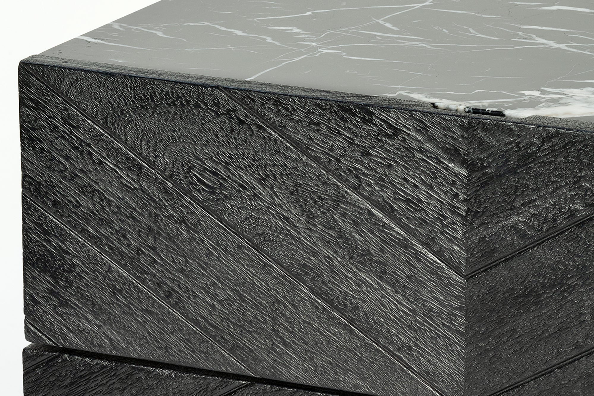 Made from mango wood in black finish and solid Carrara black marble top. Two large sliding drawers with studio carving detail on front.