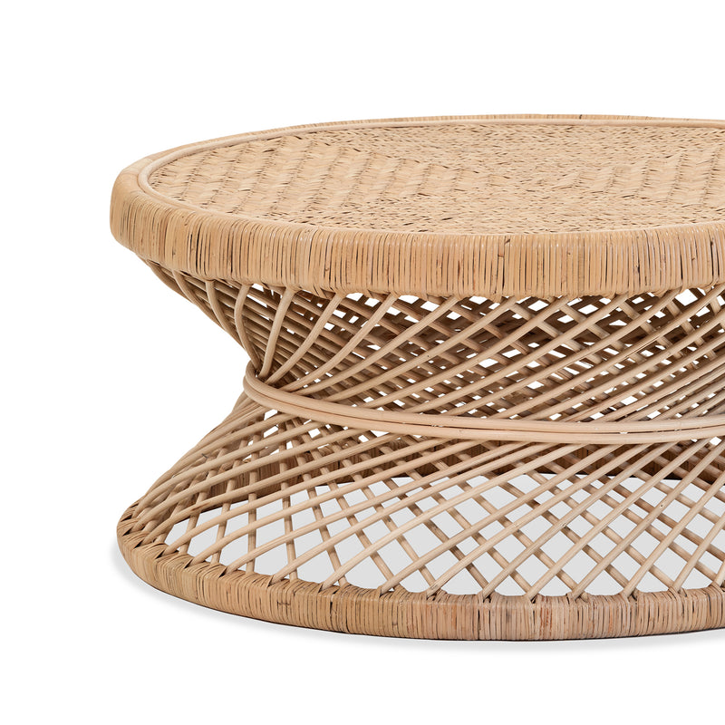 Our Savoy round coffee table is made from Natural rattan in a woven pattern. Each item is hand made by an artisan using the traditional manufacturing method of steaming the rattan to bend and form into various shapes.