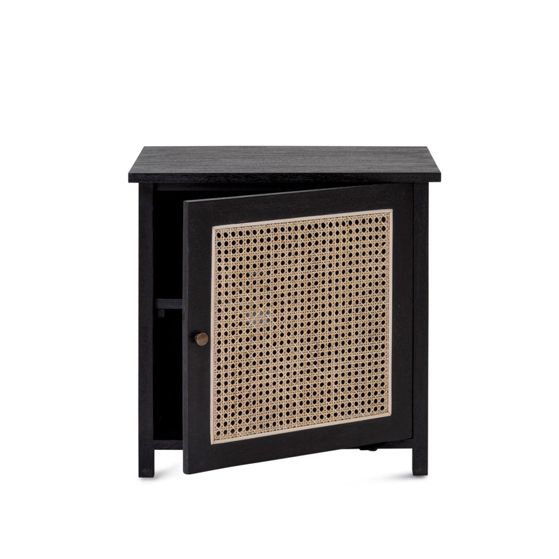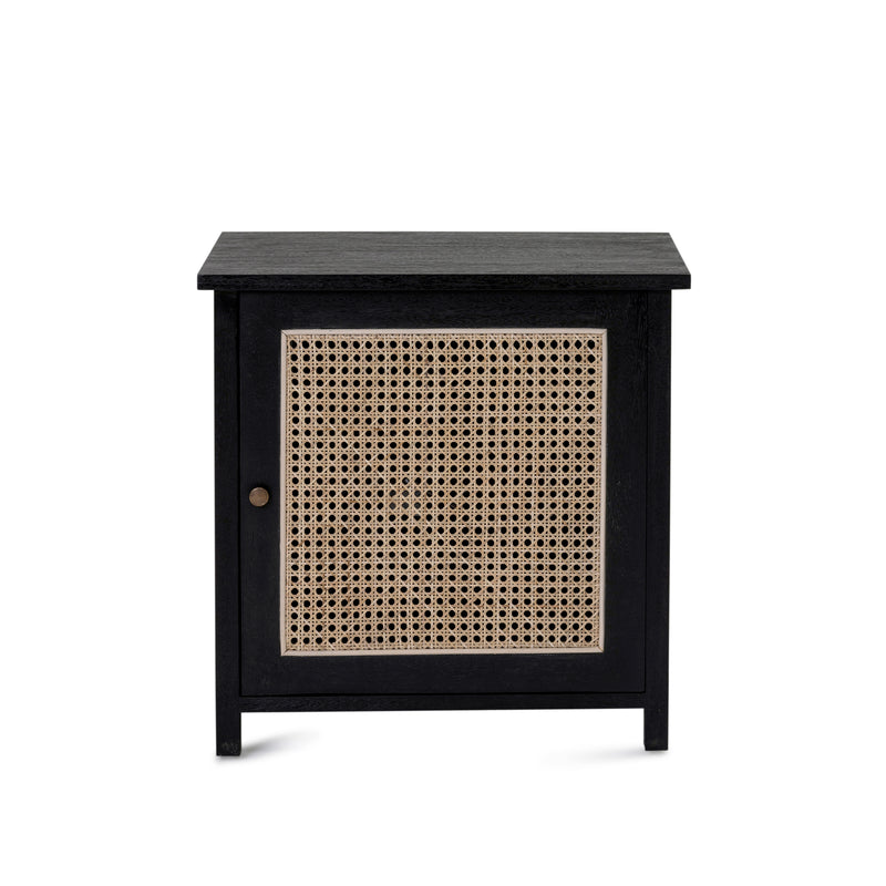 The Willow Bedside, constructed from solid mango wood in black finish with natural rattan inserts. Single opening cupboard with two hidden shelves and solid brass handle. Similar and matching items available.