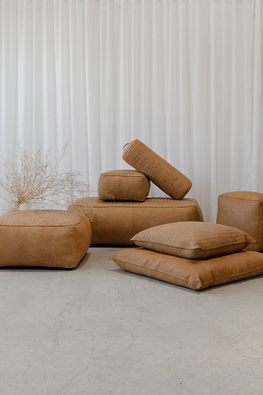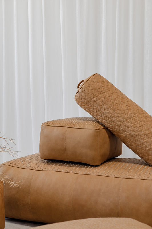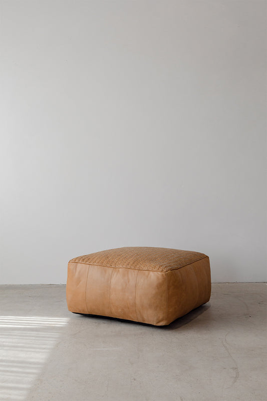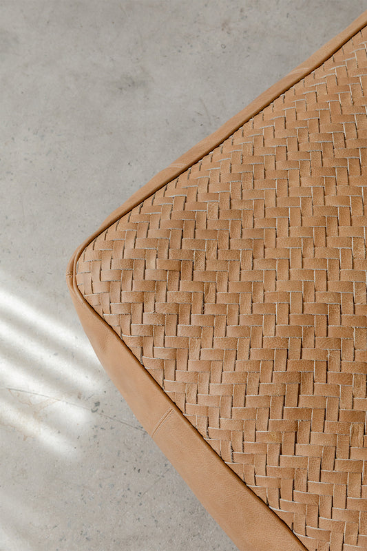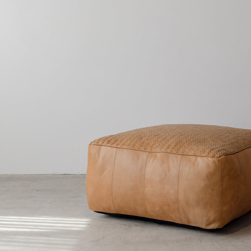 The Woven Leather ottoman features a handwoven design on the top and a sturdy cotton canvas bottom.