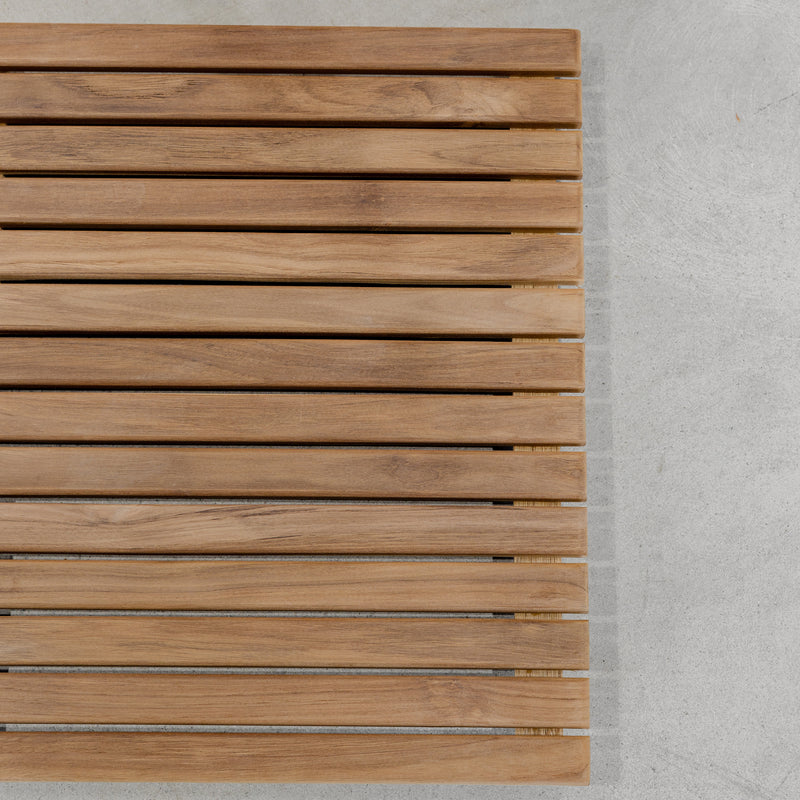 Crafted from durable teak hardwood in a natural raw finish, the Teak Atelier Bath Mat offers a clean, minimalist approach to bathroom design. The streamlined slatted construction allows water to drain easily, while the border-free profile creates a relaxed, contemporary look. Naturally water-resistant, teak is ideal for bathroom environments, bringing warmth, functionality and timeless appeal to everyday routines.