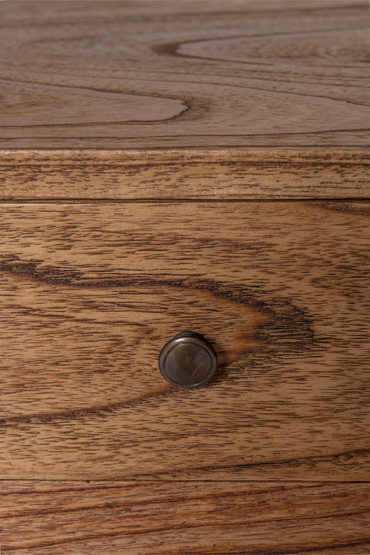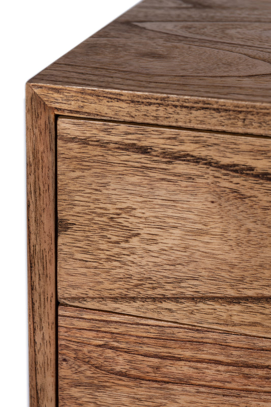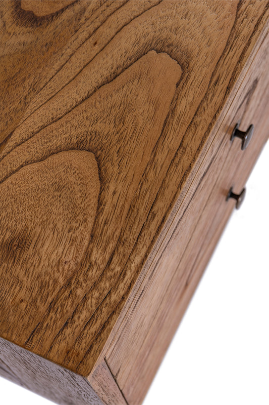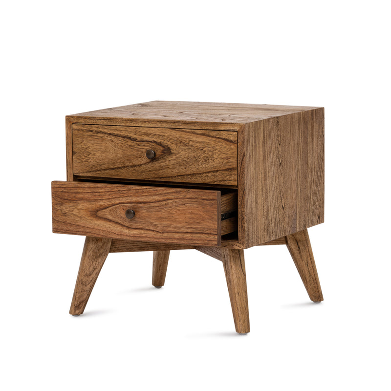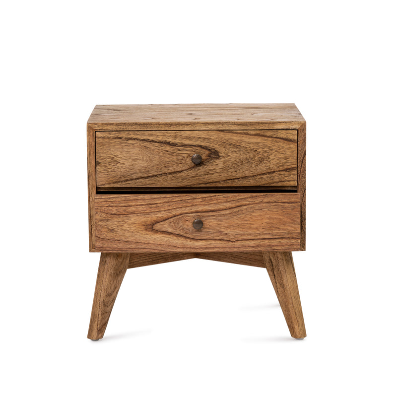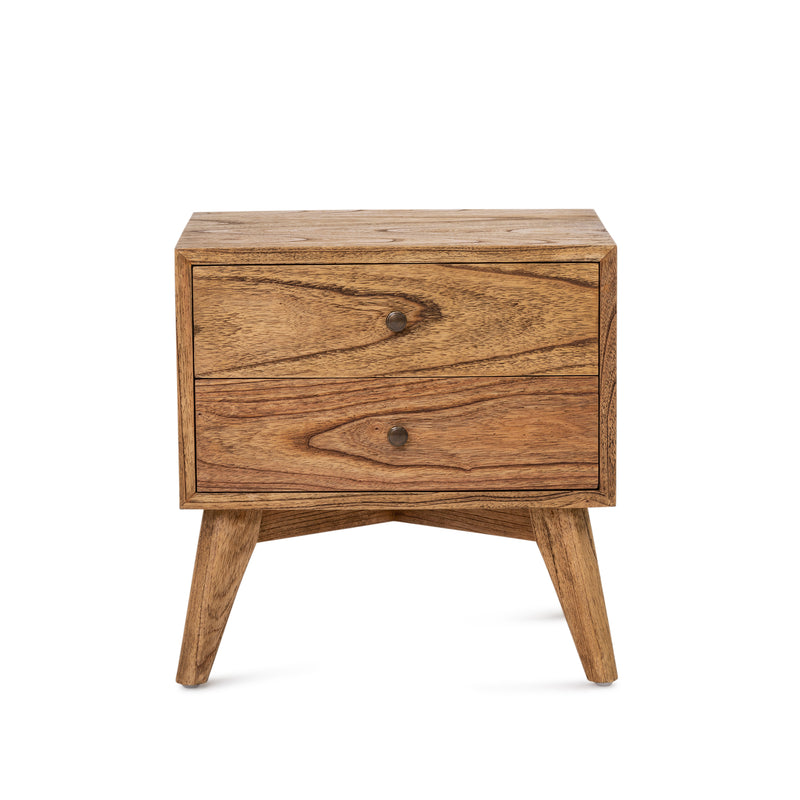 The Marilyn Bedside, made from solid mindi wood in an antique finish, featuring two sliding drawers, tapered legs and solid round brass handles. Also available with marble top.