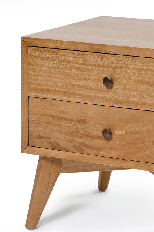 Made from mango wood in a Natural Sealed finish with two sliding drawers, tapered legs and solid round brass handles. Also available with marble top.