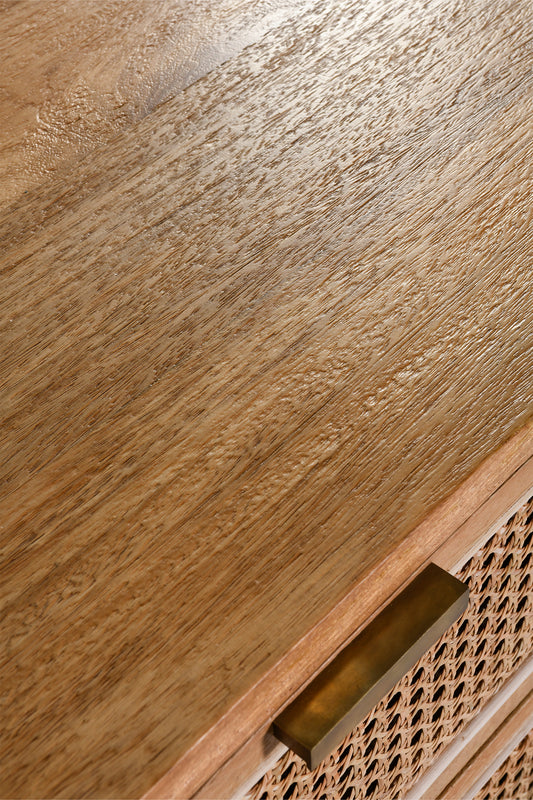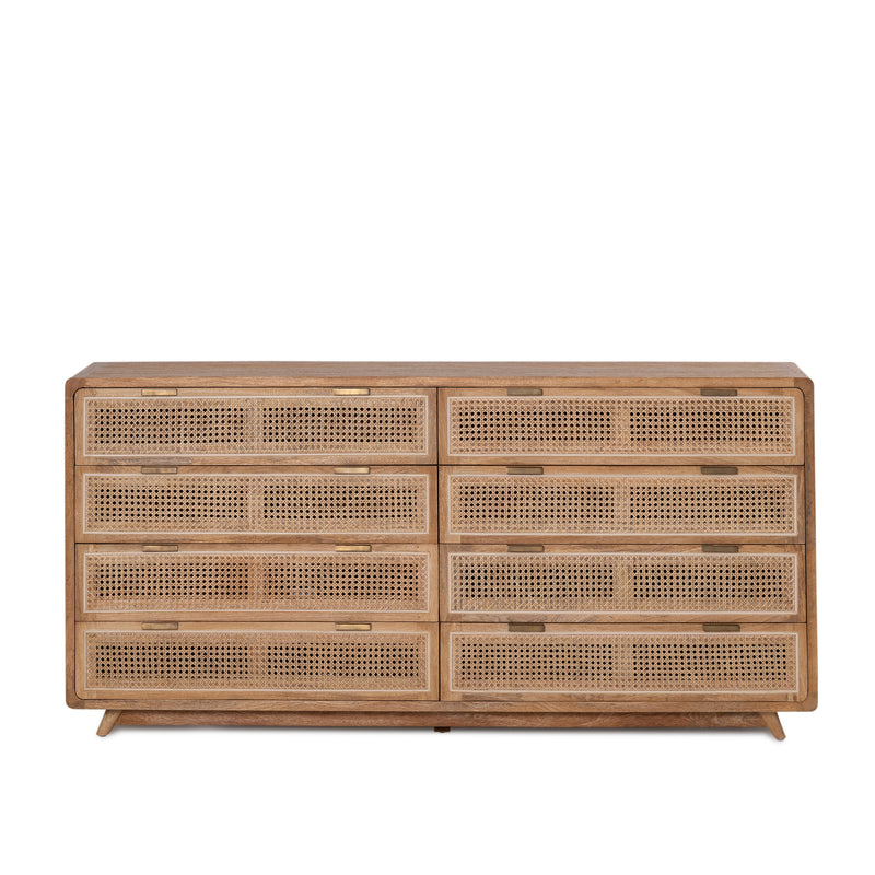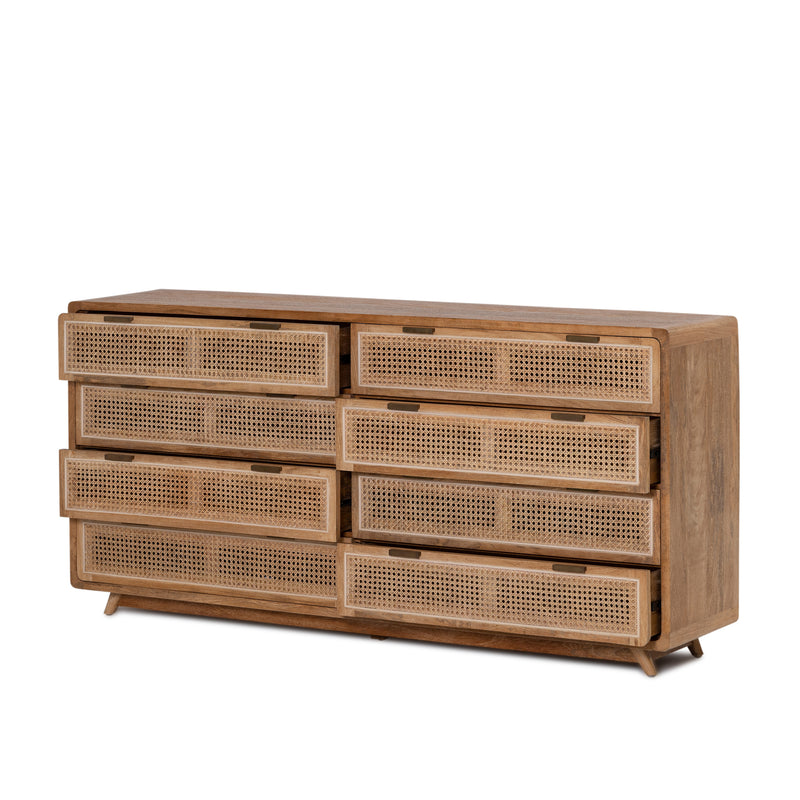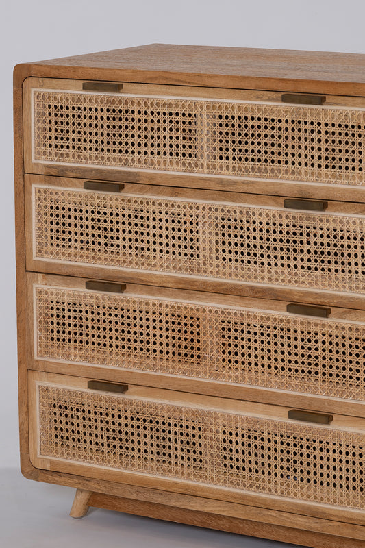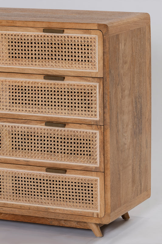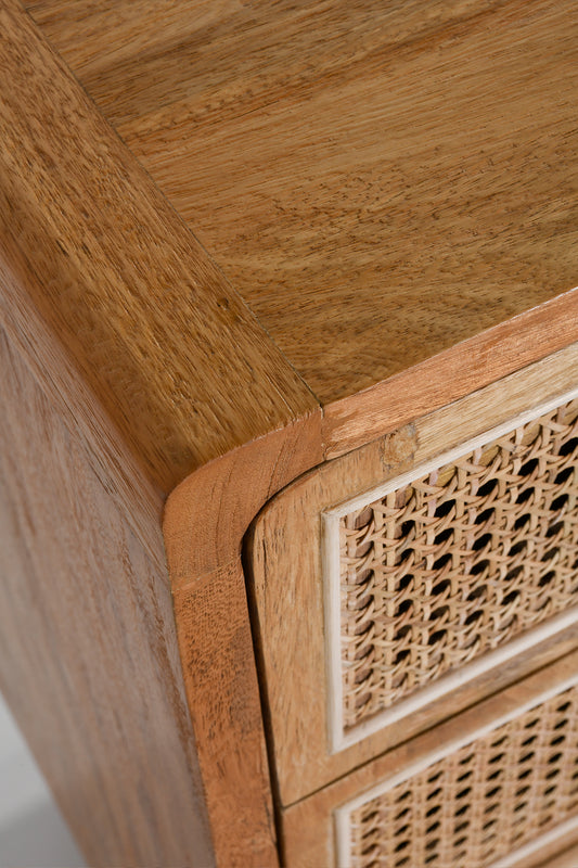 The Romeo Chest features a rounded frame made from solid mango wood in a rustic matte finish, with a natural rattan insert on the drawers.
