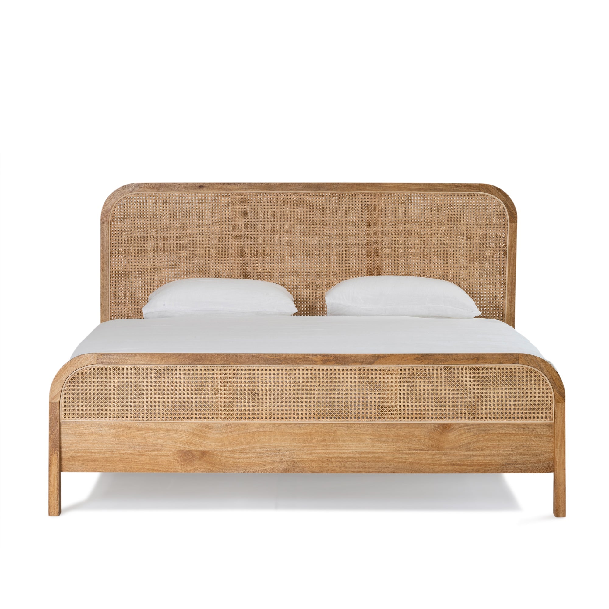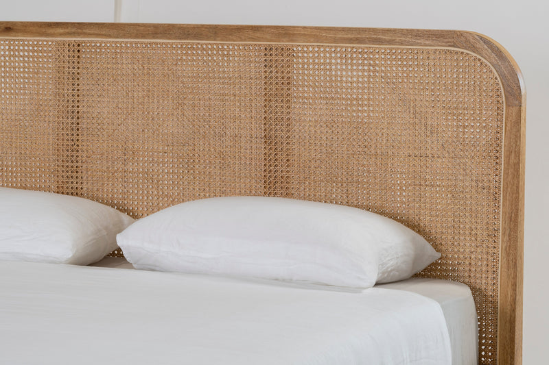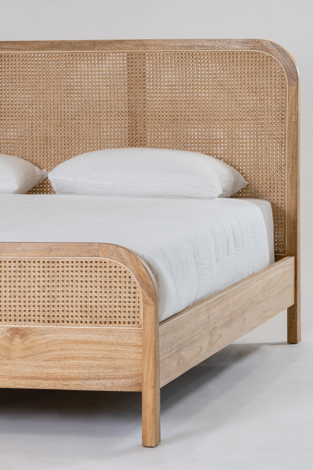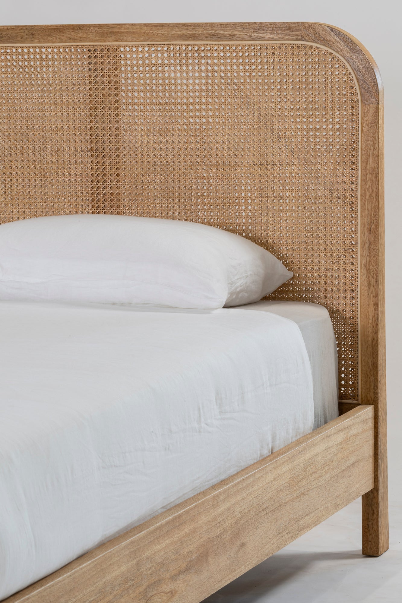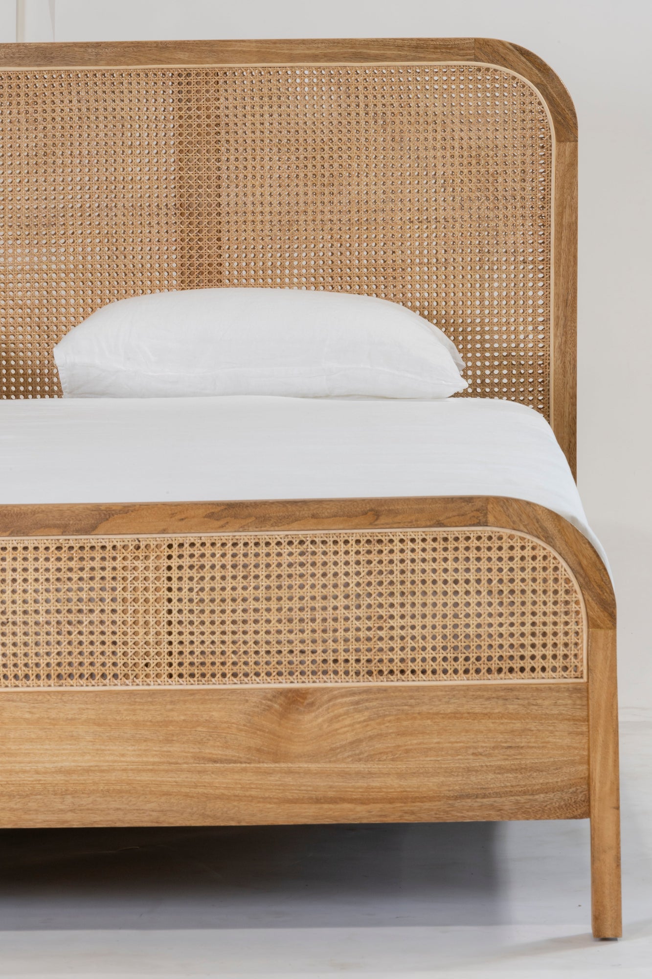 - Solid mango wood in rustic matte finish with natural rattan insert.