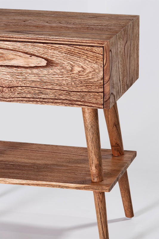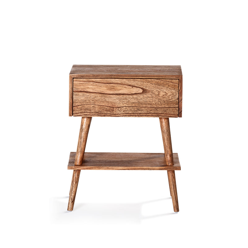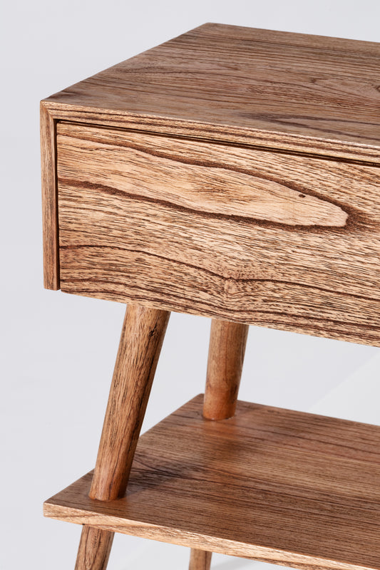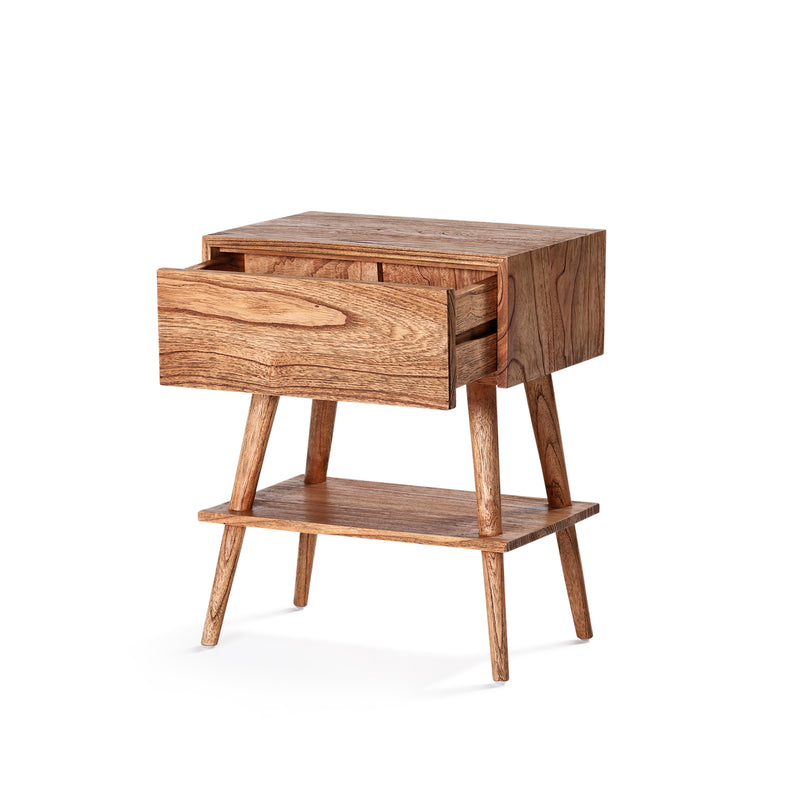 The Amsterdam bedside with shelf has one drawer and shelf below, with four tapered legs. Built from solid mindi wood in Antique Mindi finish.