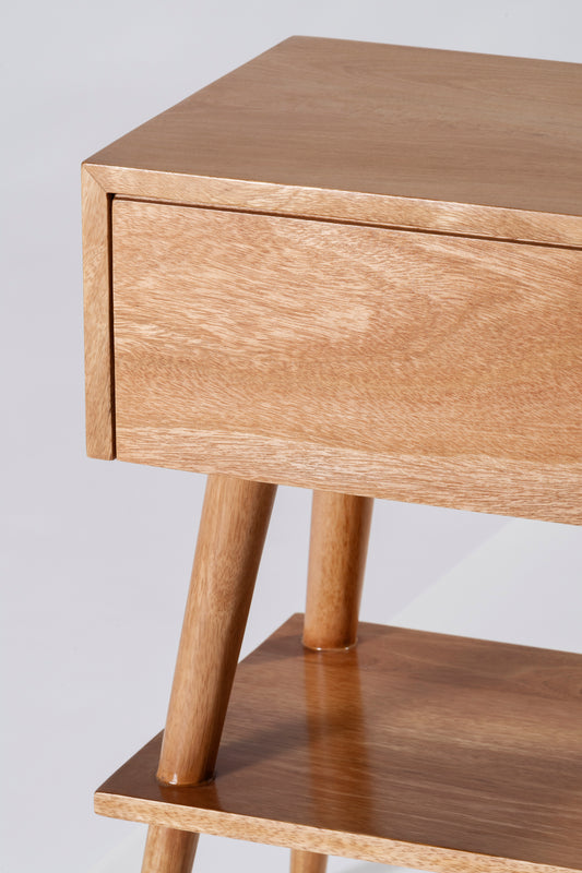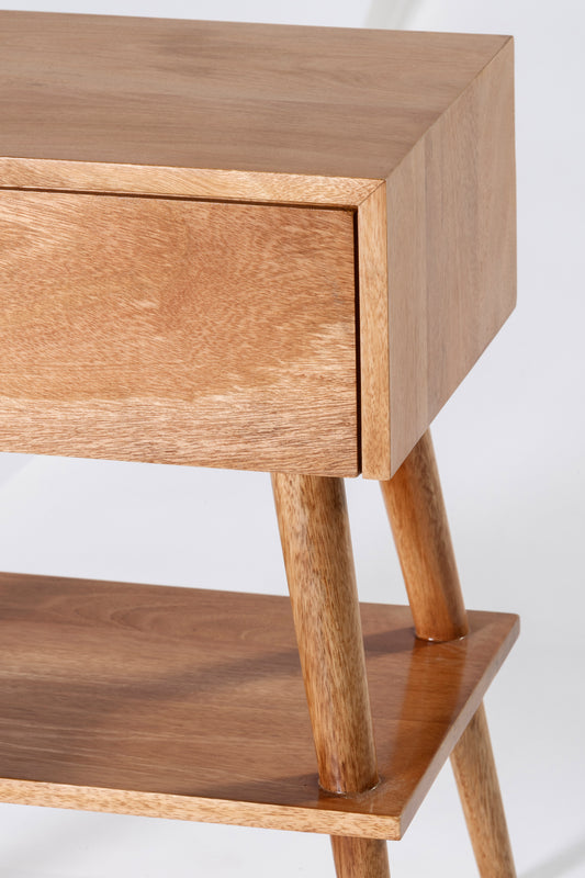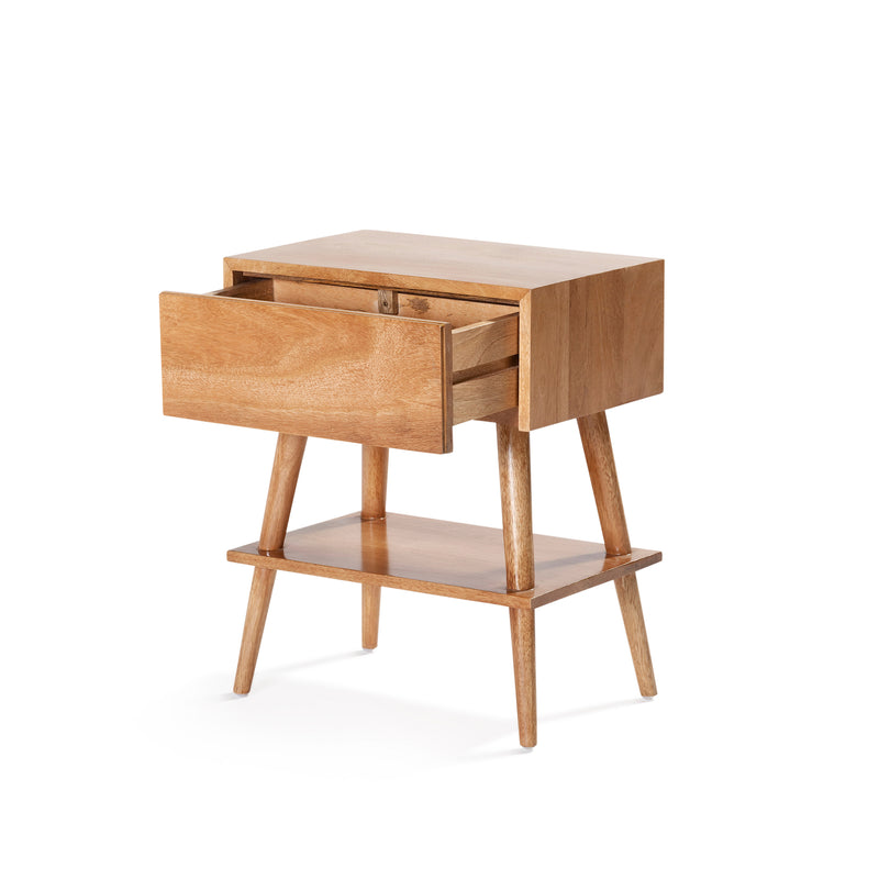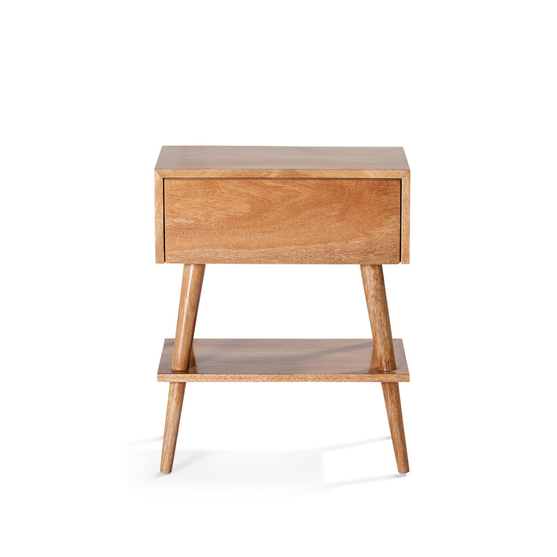 The Amsterdam bedside with shelf has one drawer and shelf below, with four tapered legs. Built from solid mango wood in natural sealed finish.