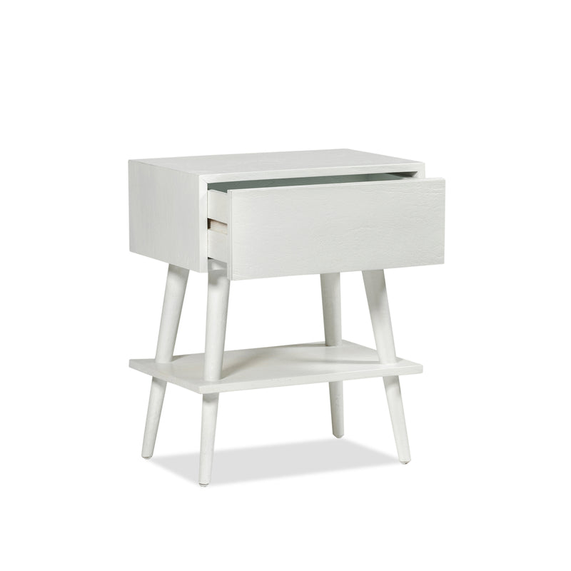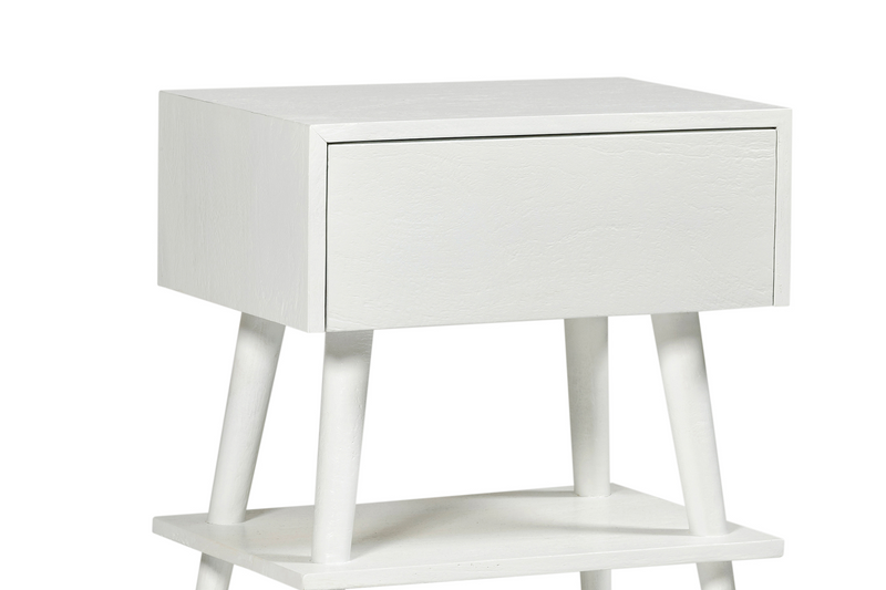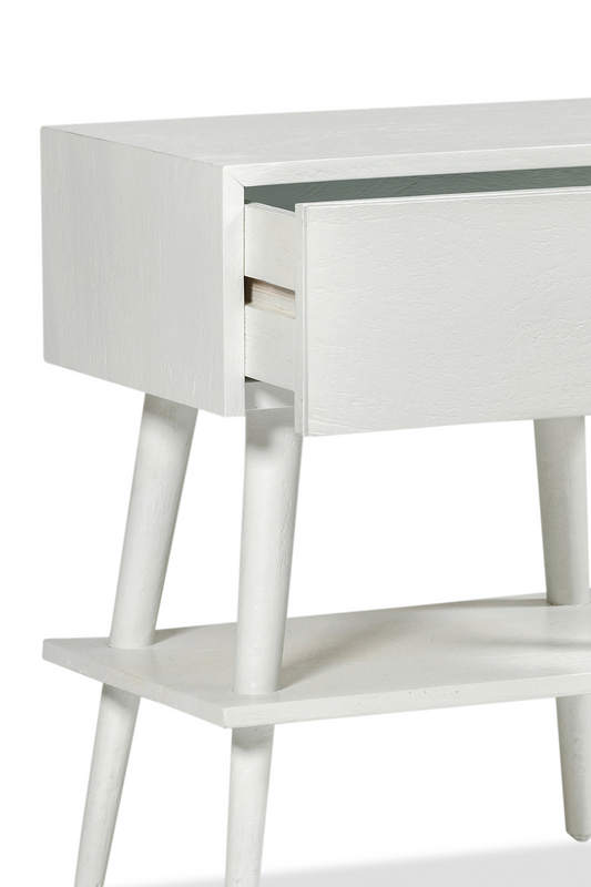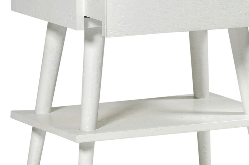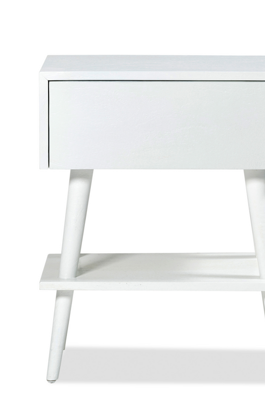 The Amsterdam bedside with shelf has one drawer and shelf below, with four tapered legs. Built from solid mango wood in white finish.