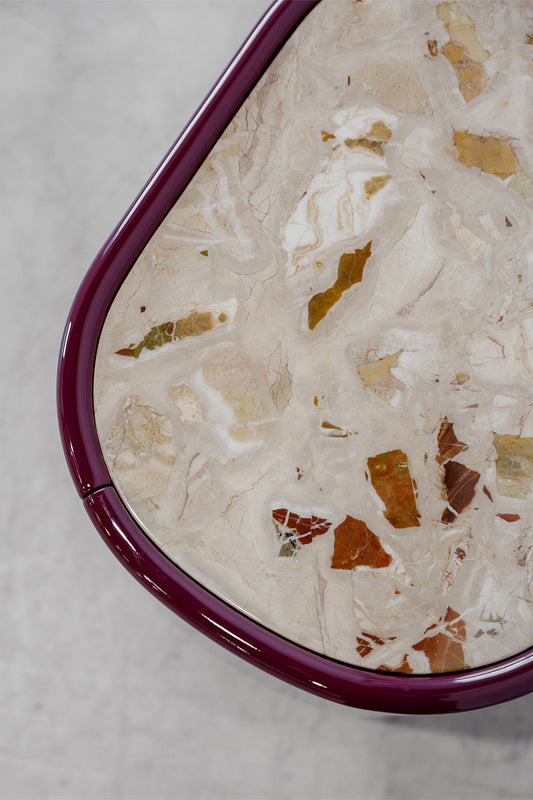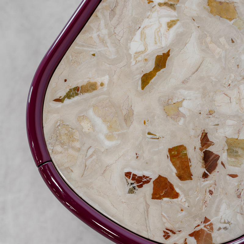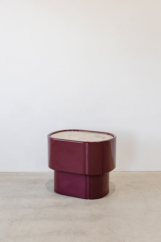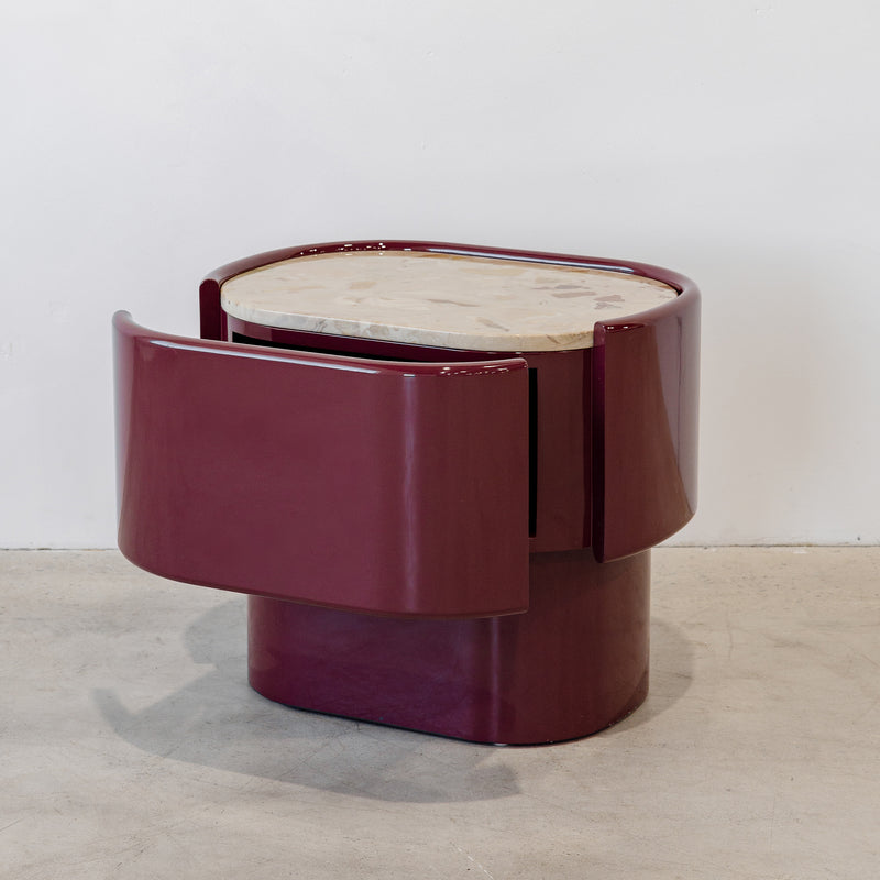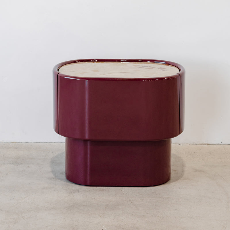 Soft in its form and strong in its presence this side table offers moody elegance with its rich glossy tones and striking marble top. A functional statement piece that echoes retro charm.