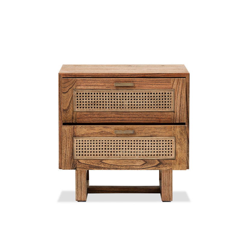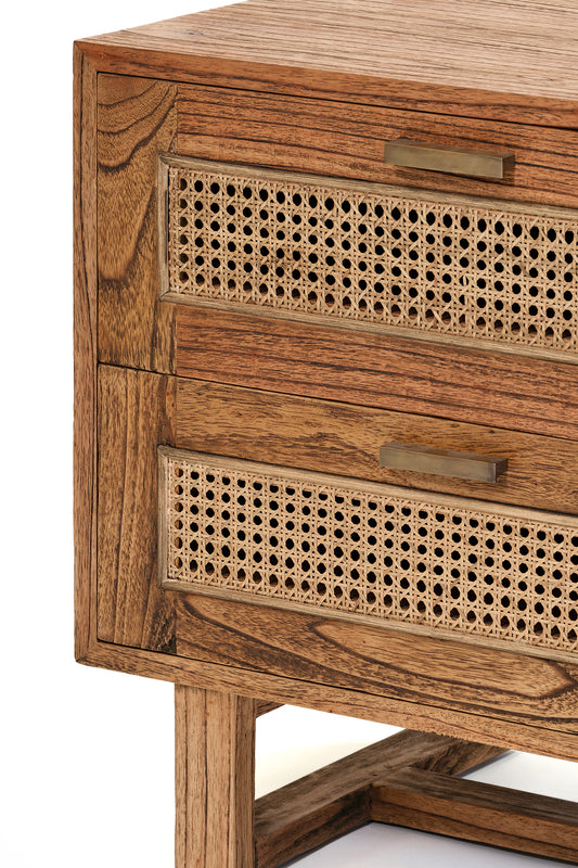 Built from mindi wood in antique finish. Two large storage drawers with natural rattan inserts and solid brass handles.