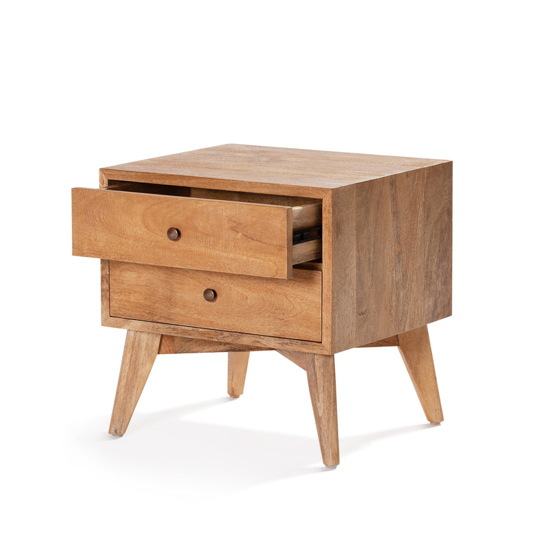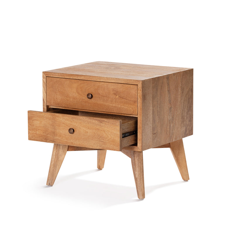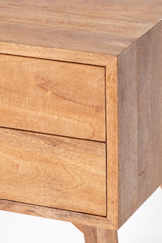 Made from mango wood in Rustic Matte finish with two sliding drawers, tapered legs and solid round brass handles. Also available with marble top.