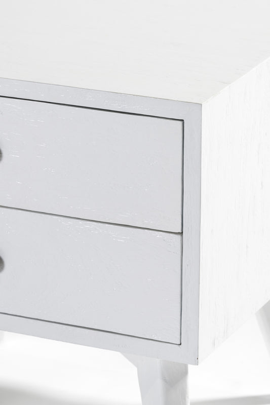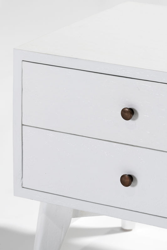 Made from mango wood in a white finish with two sliding drawers, tapered legs and solid round brass handles. Also available with marble top.