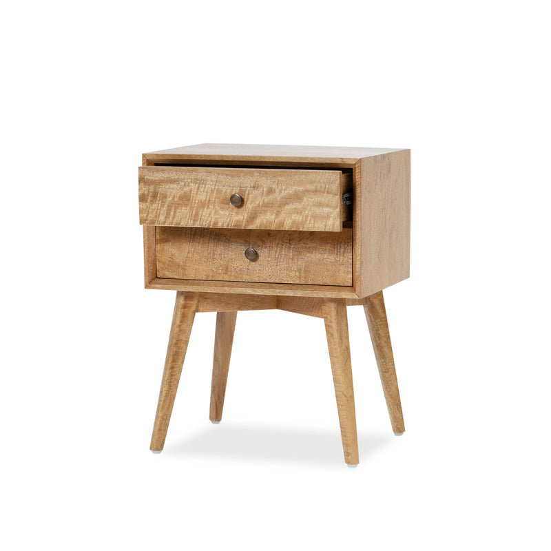 Made from mango wood in Natural Sealed finish with two sliding drawers, slightly tapered legs and solid round brass handles.
