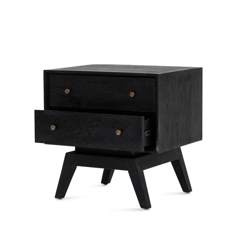 The Sari Bedside, made from mango wood in black finish featuring two sliding drawers with solid brass handles.