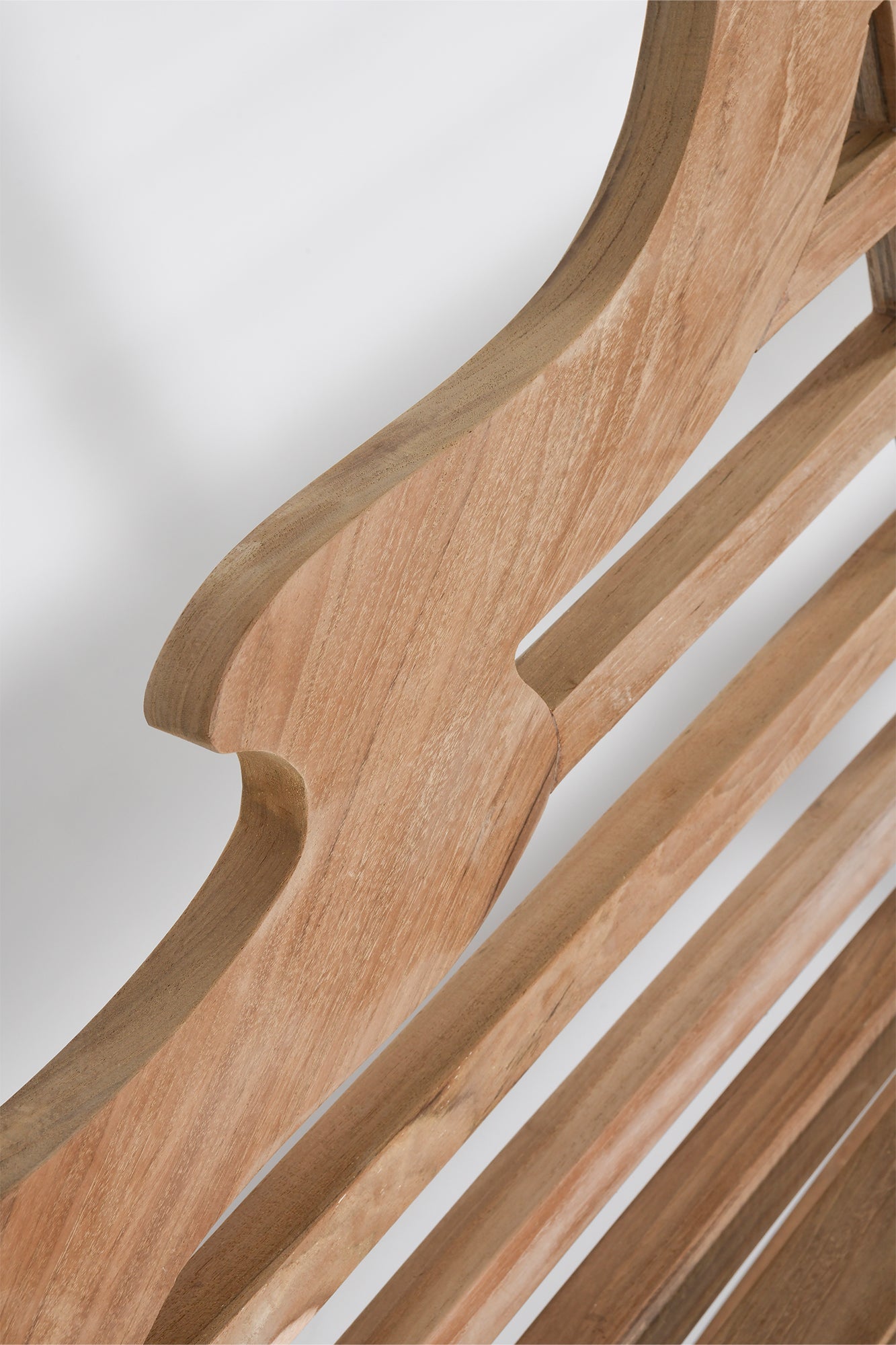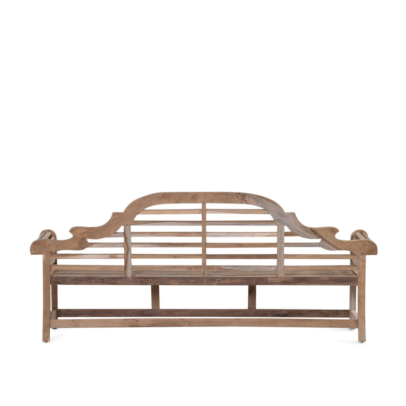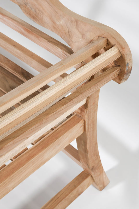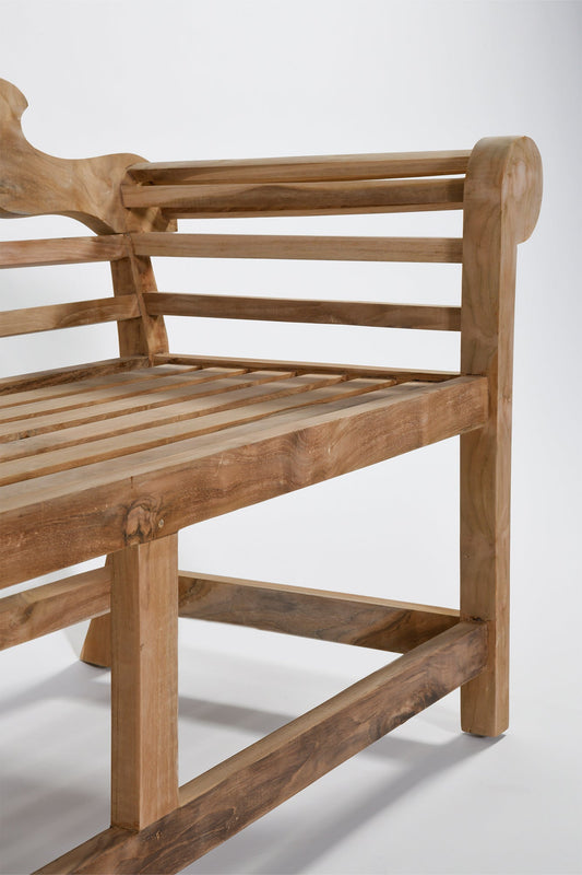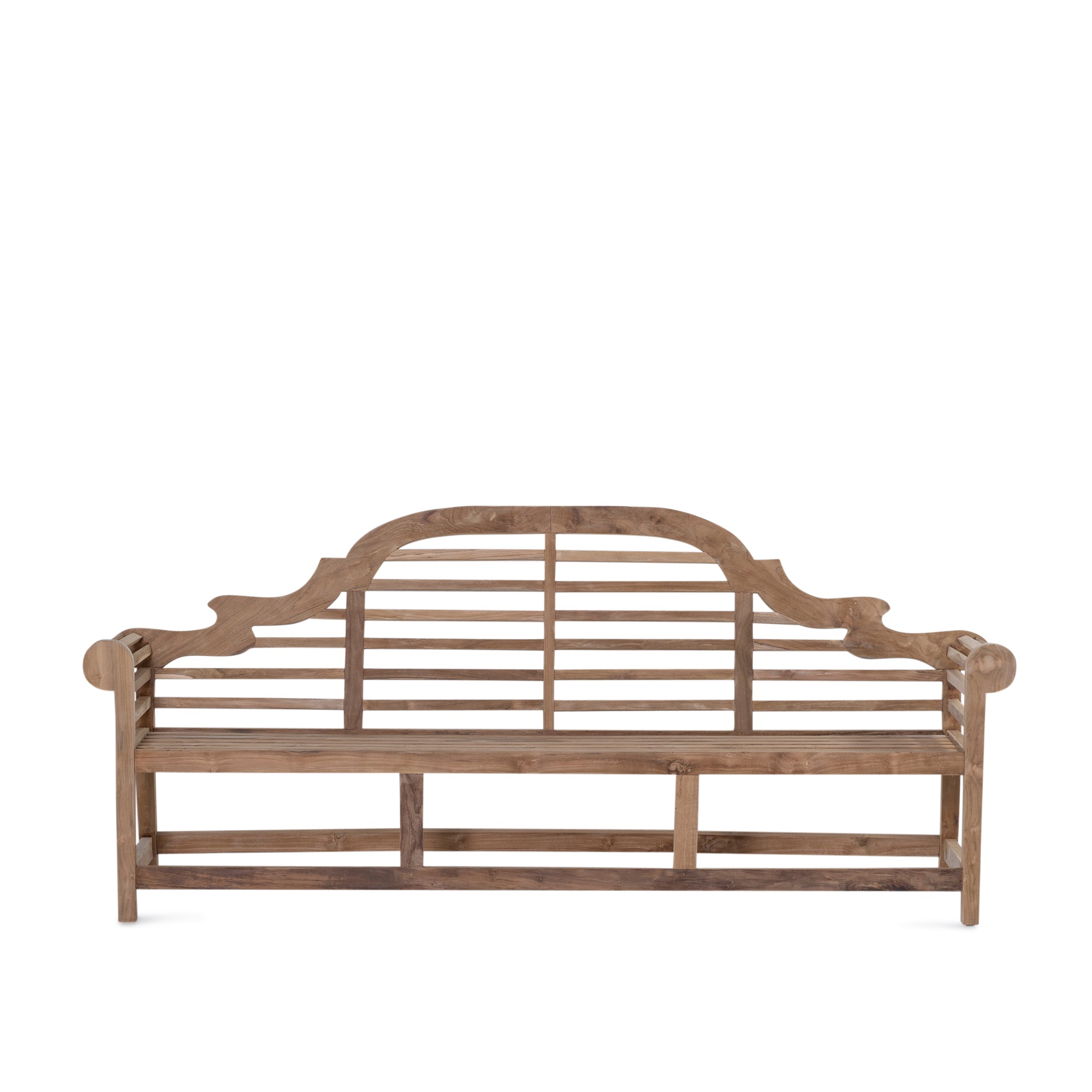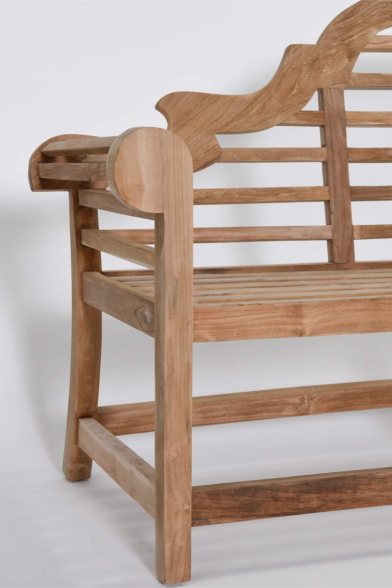 The traditional style Marlboro bench features curved arms and an elegantly symmetrical design to enhance any outdoor area. Made of high-quality teak in a raw finish.