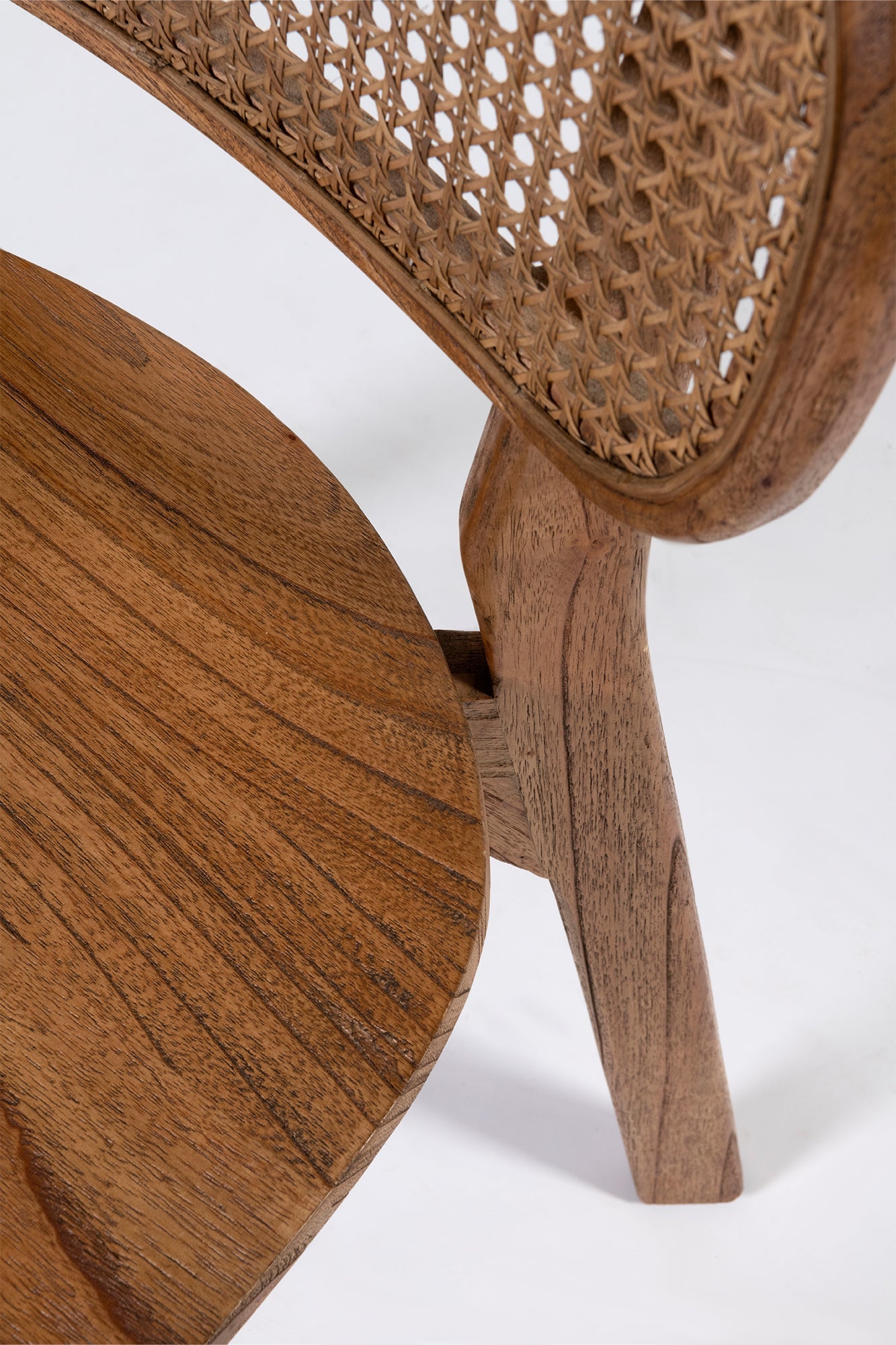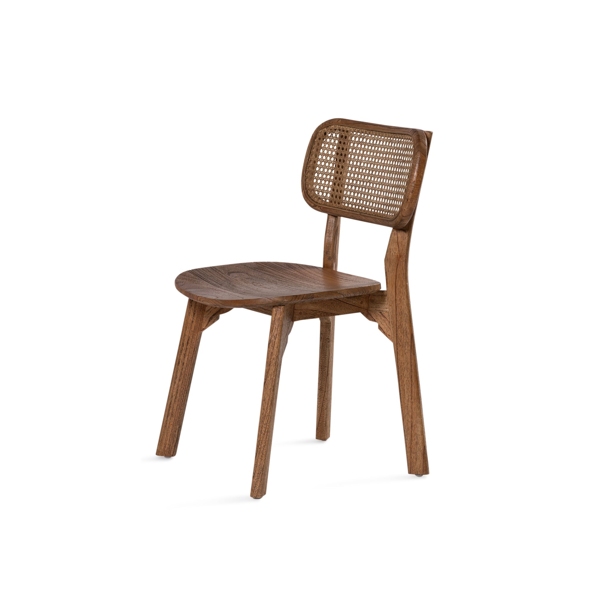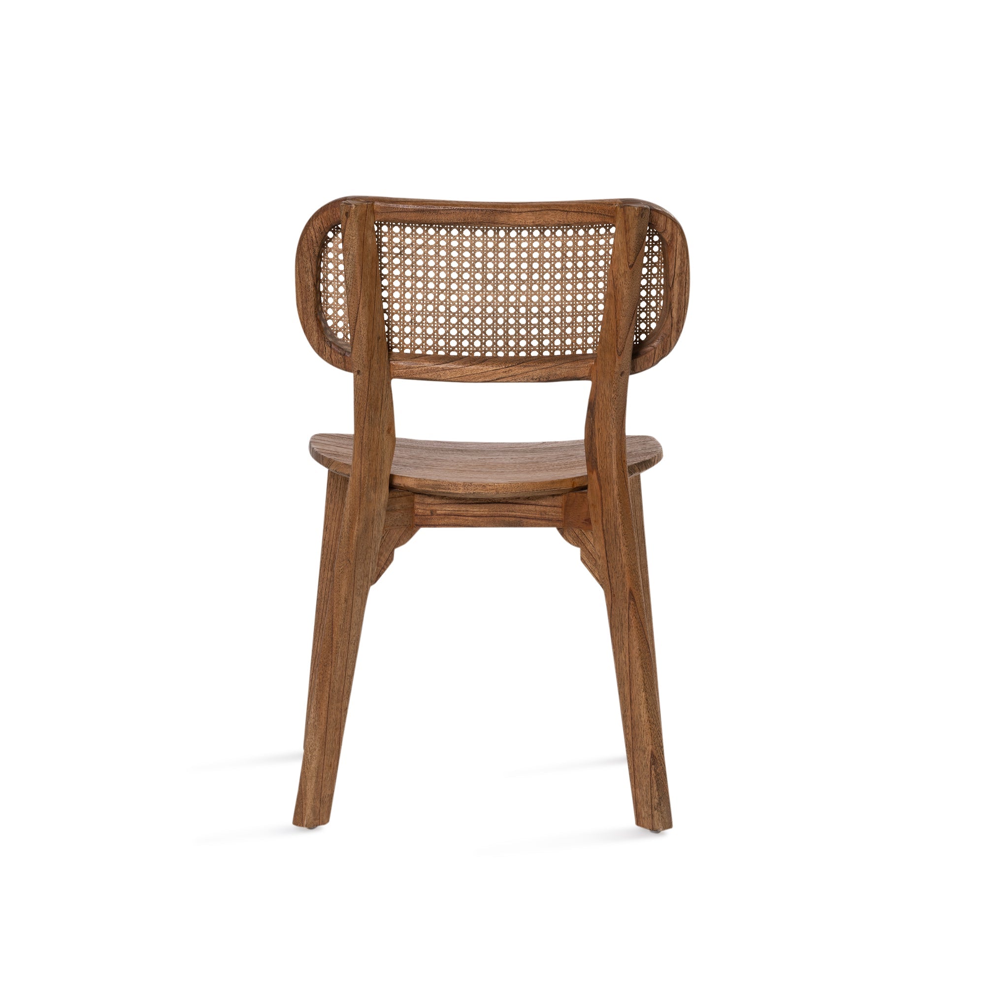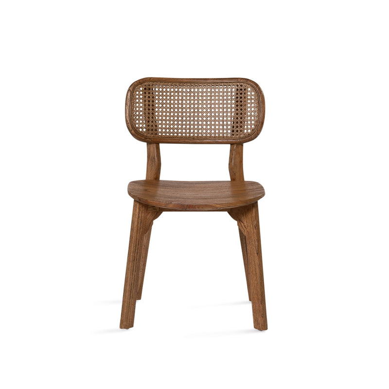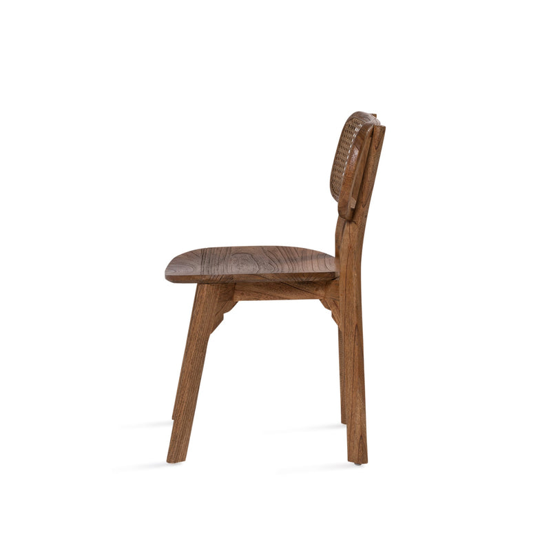 The Lova chair constructed from solid mindi wood in antique finish, featuring subtly curved legs and rounded back rest with antique rattan insert. Both comfortable and stylish.