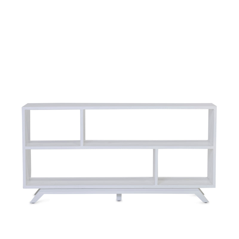 Avoca bookcase or shelving unit is built from solid mango wood in white finish. Two open shelves are divided to create four spaces for optimum storage and display.