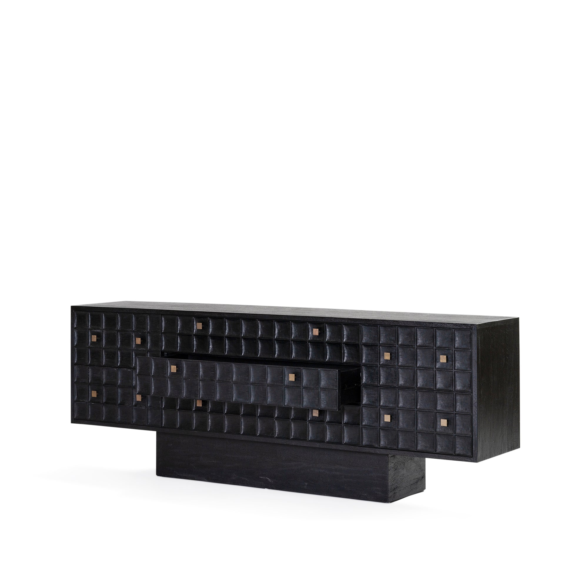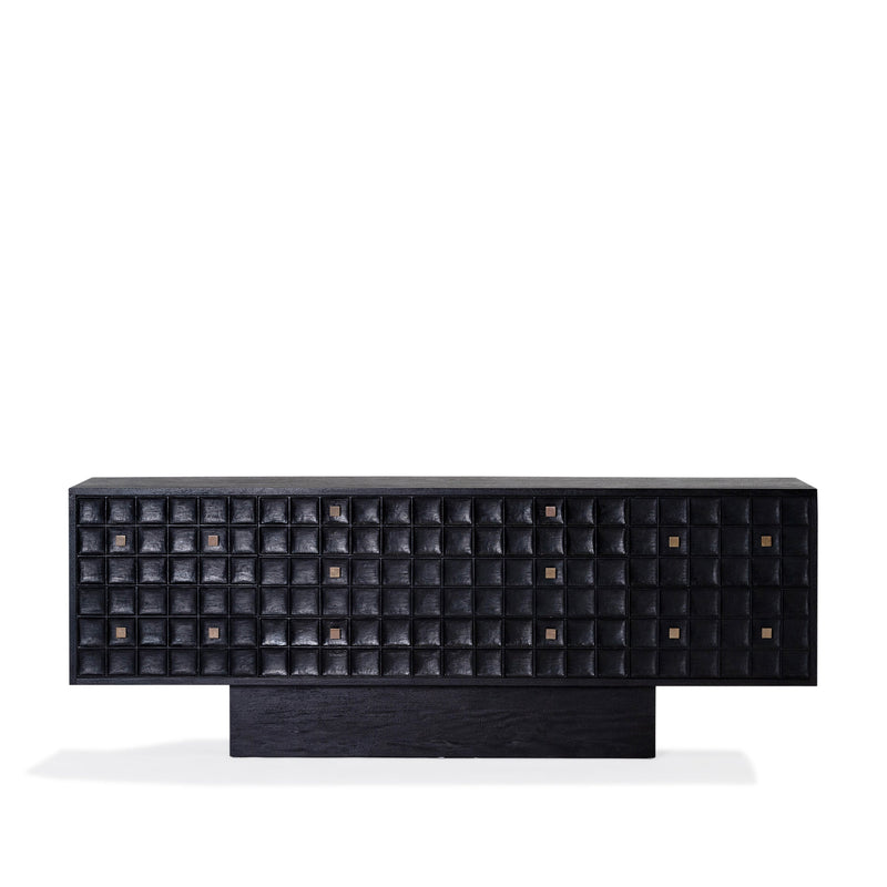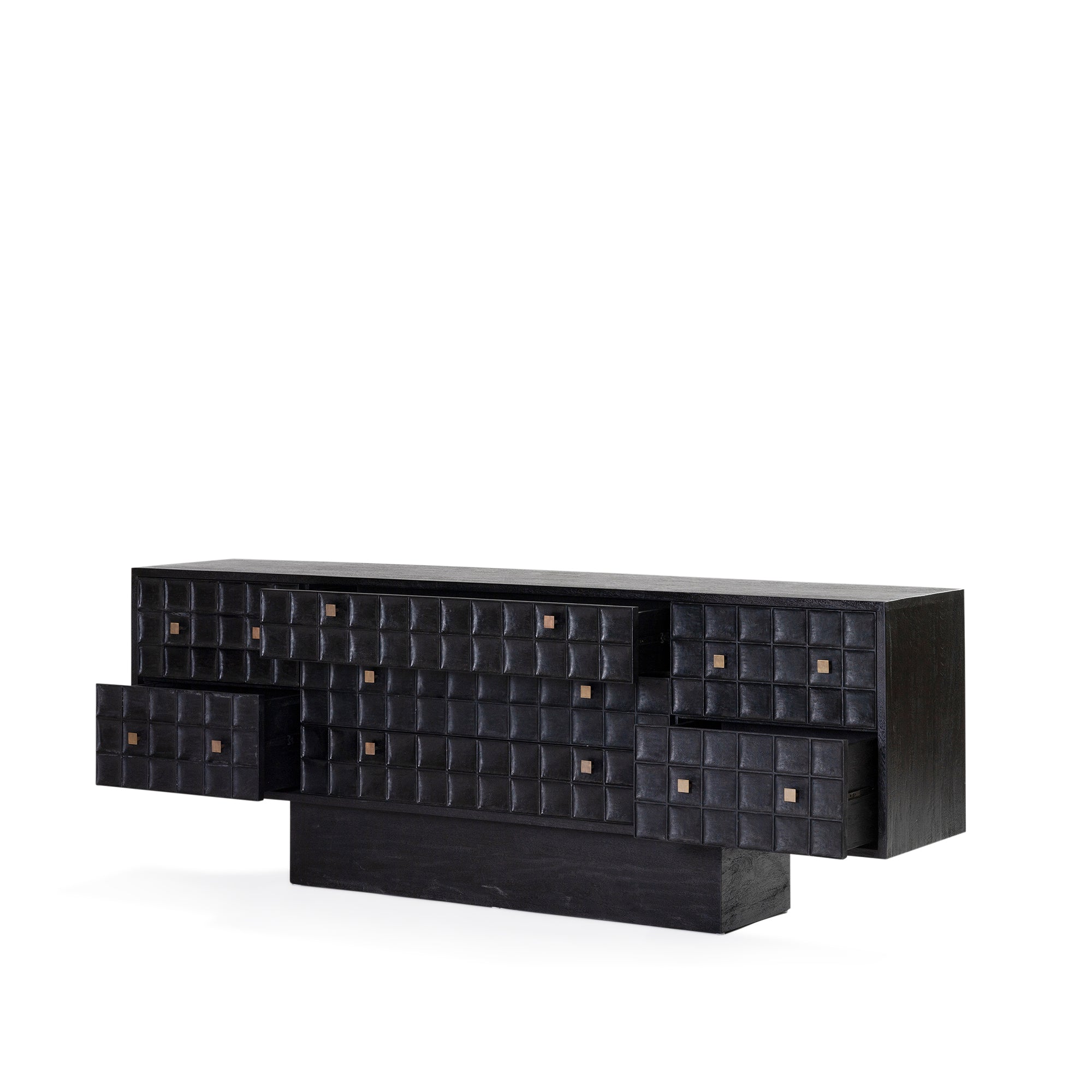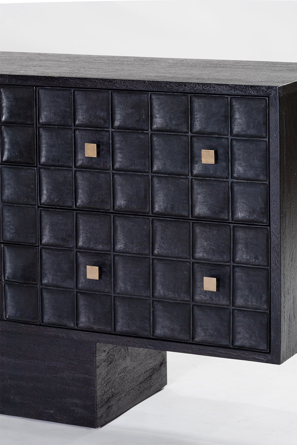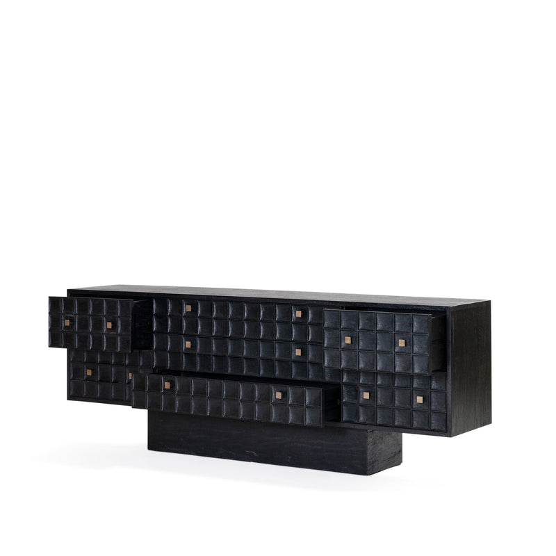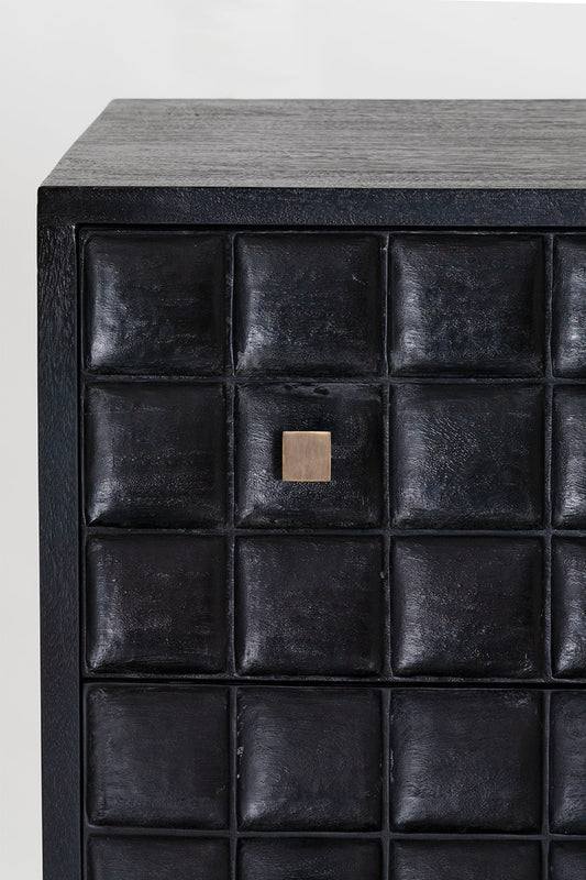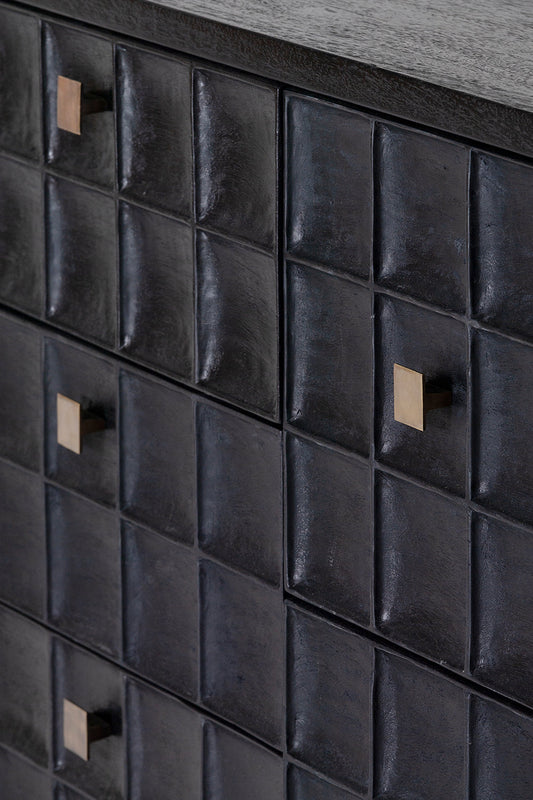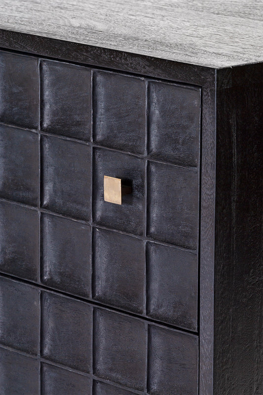 Built from solid mango wood in a Black finish. Featuring a beautiful hand carved geometric square pattern across its 7 drawers and solid square brass handles.