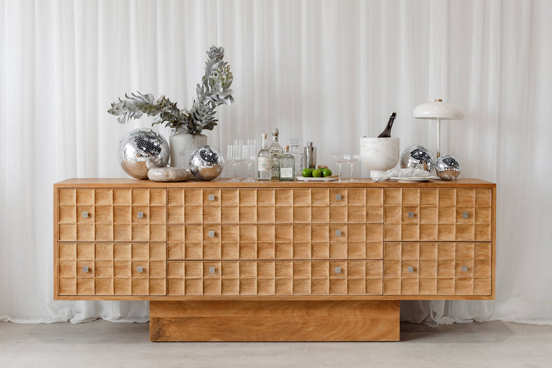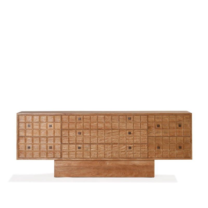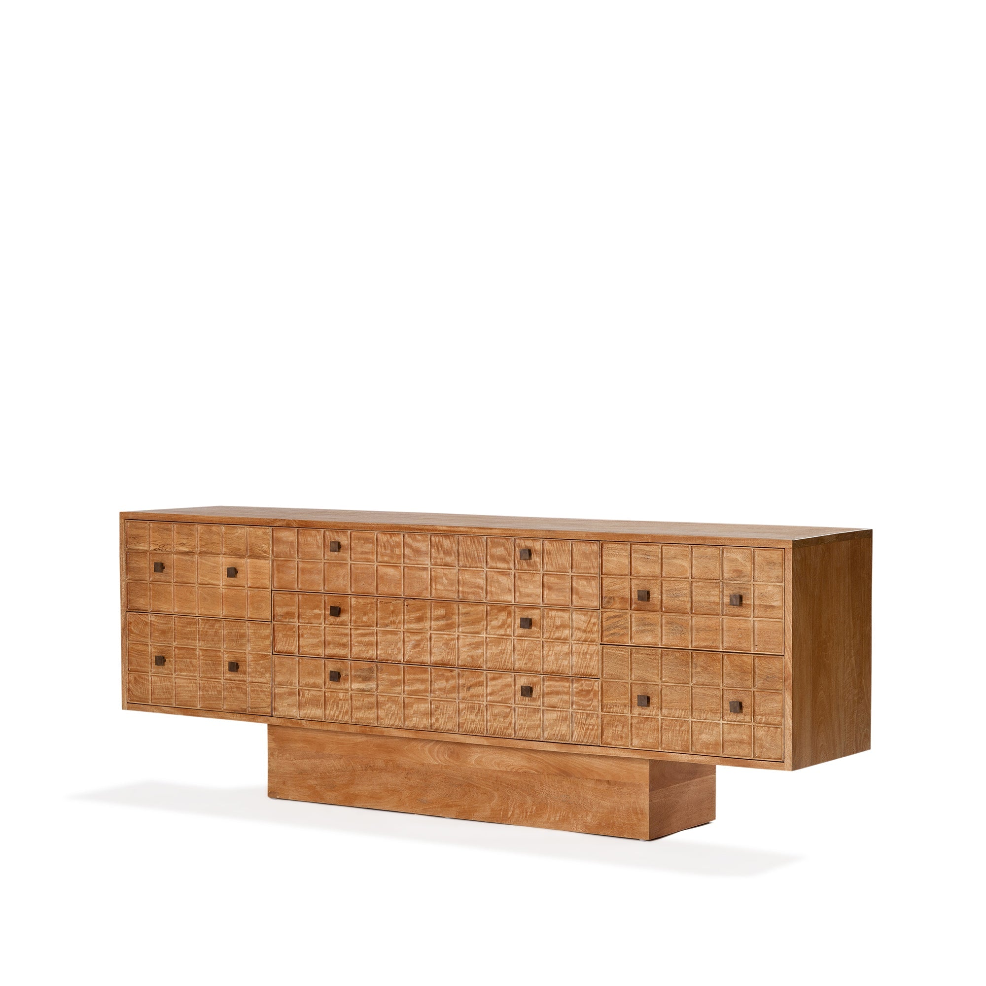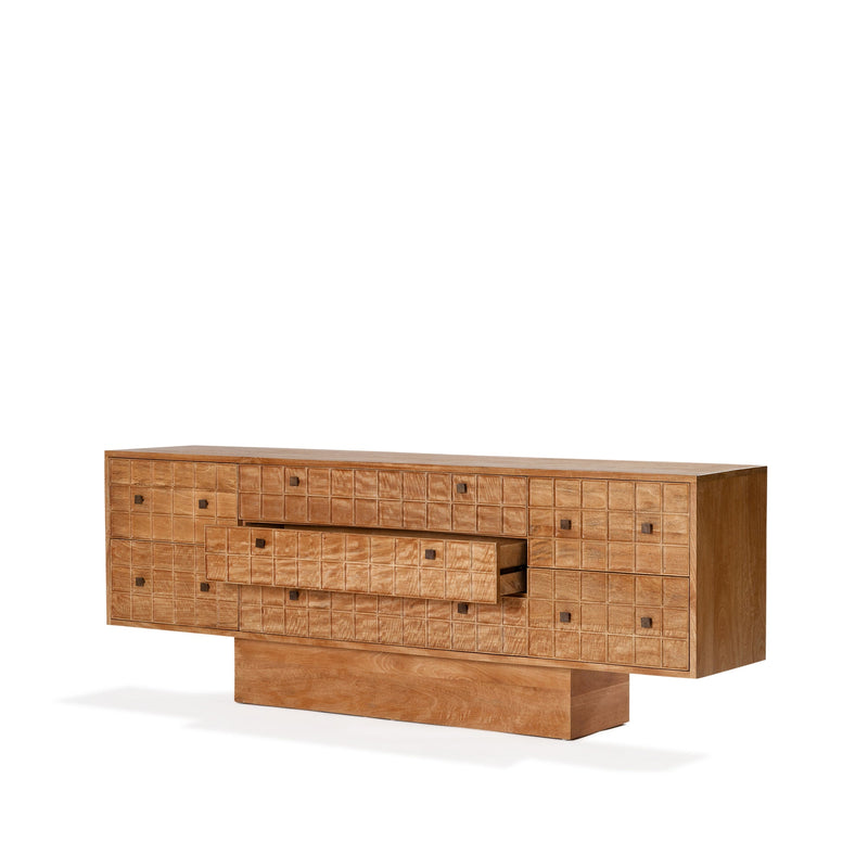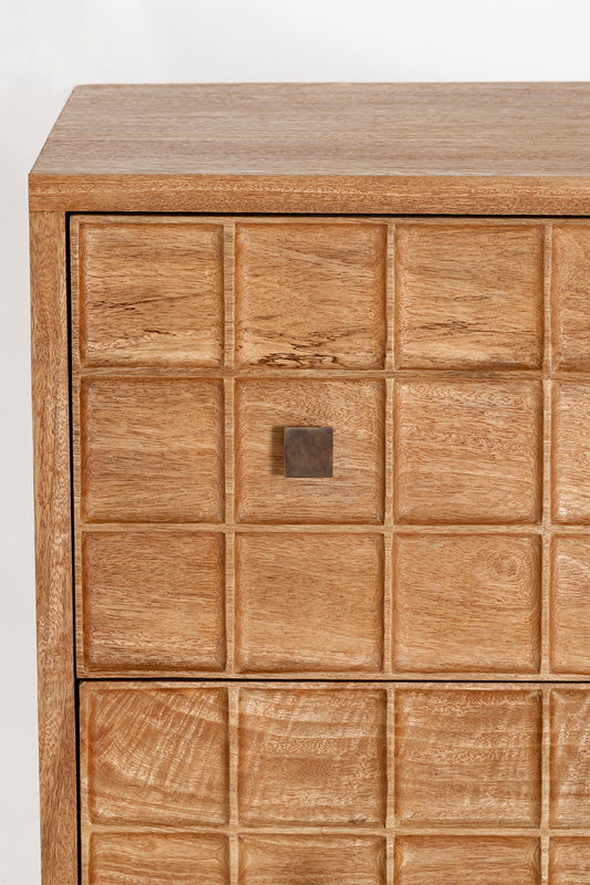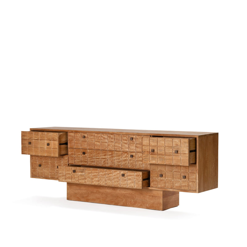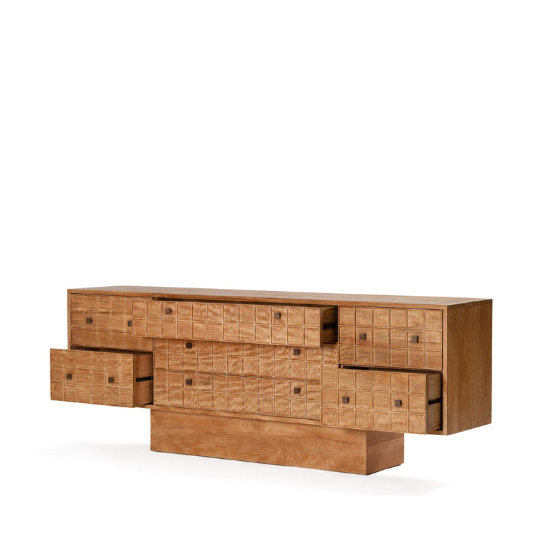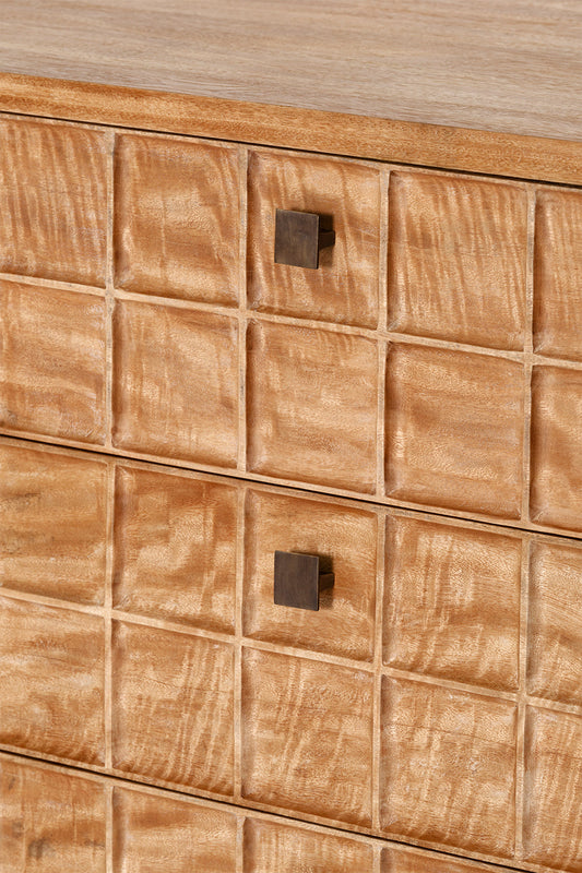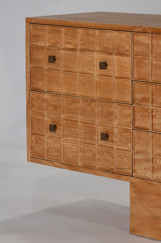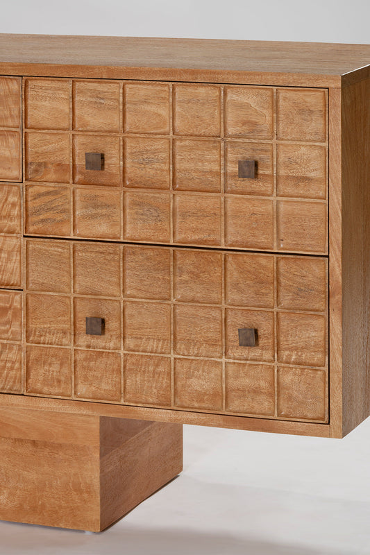 Built from solid mango wood in a Rustic Matte finish. Featuring a beautiful hand carved geometric square pattern across its 7 drawers and solid square brass handles.