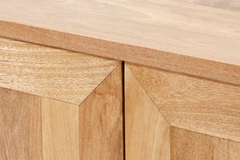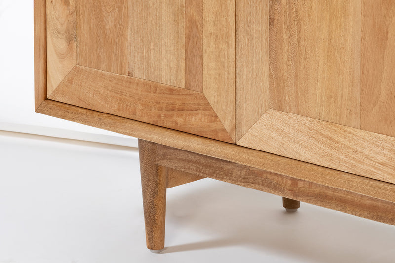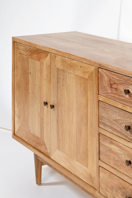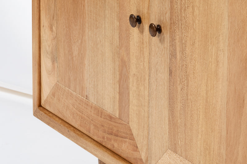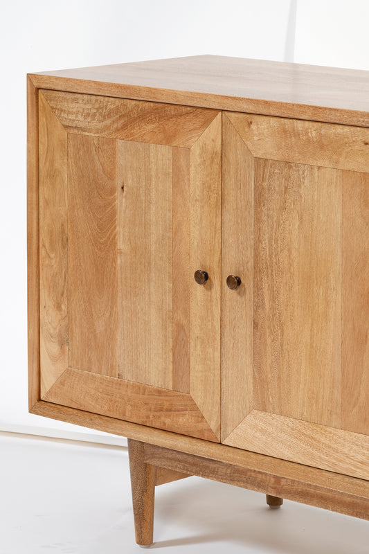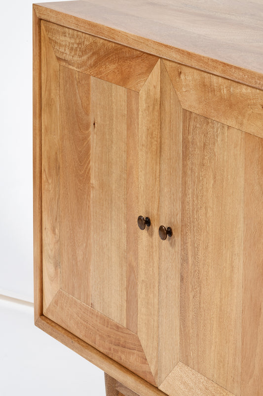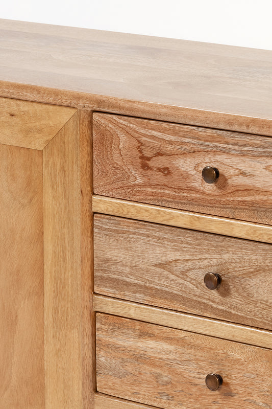 The Lia Mini Buffet built from solid mango wood in Natural Sealed finish. Four doors and four drawers for optimal storage, with solid round brass handles.