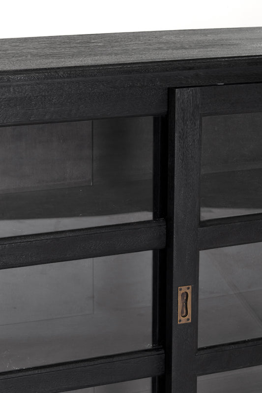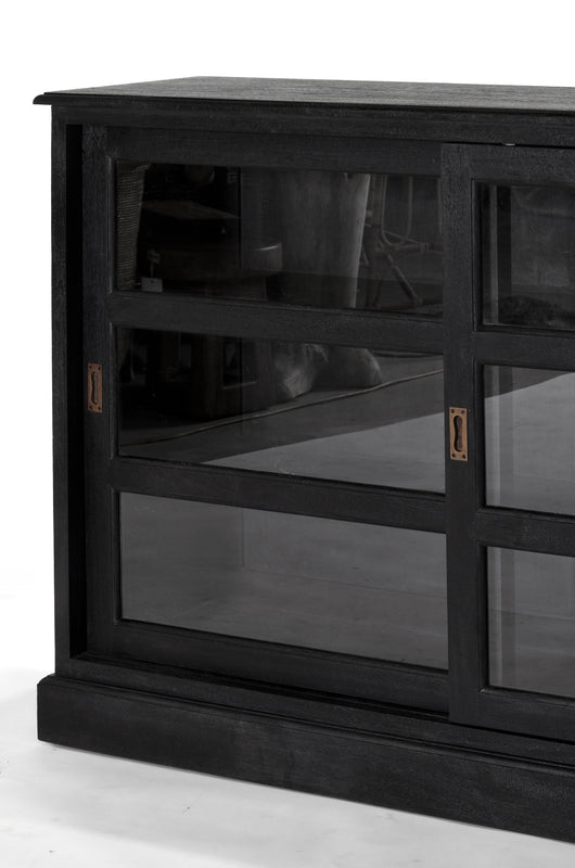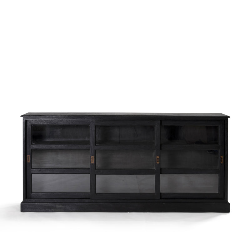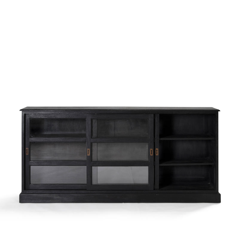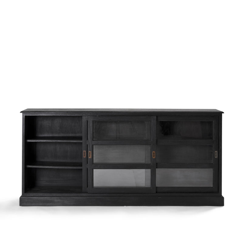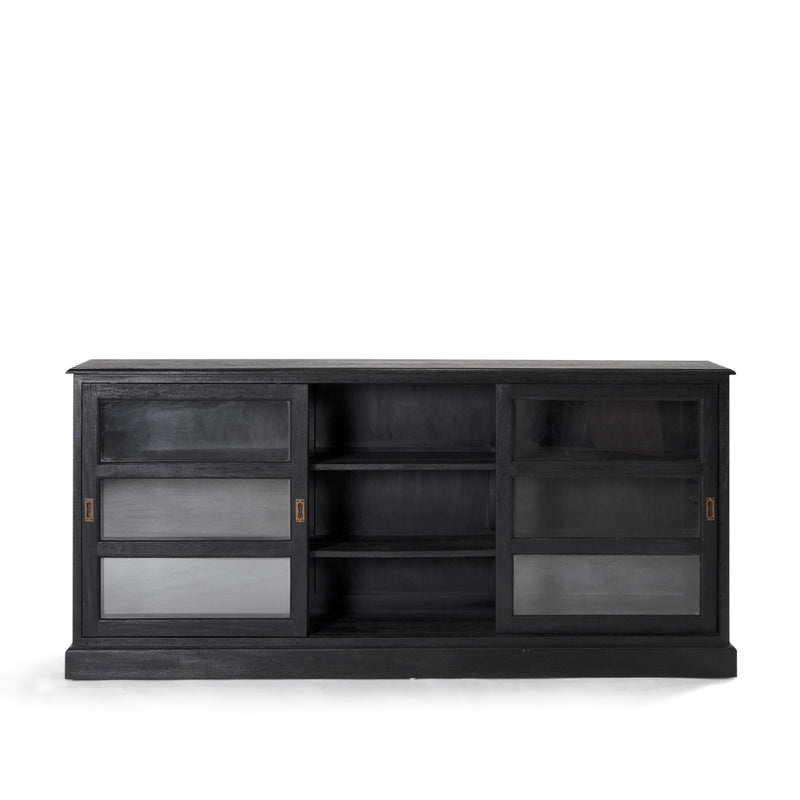 Constructed from solid mango wood, the Maya Sliding Door Buffet offers a three door sliding storage space with fixed shelving. Adorned with beautiful panelled detailing and glass inlay for an elegant furniture piece to stand the test of time.