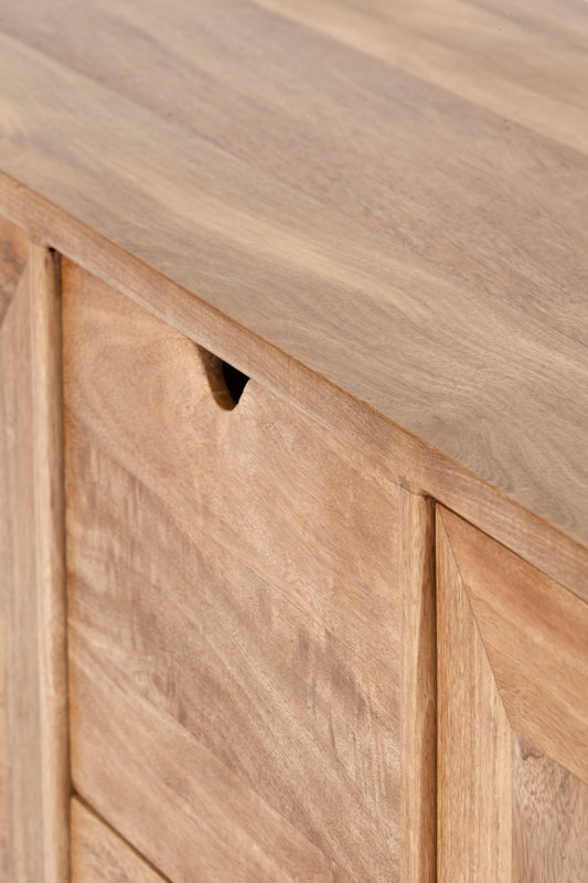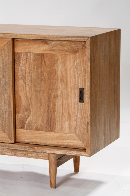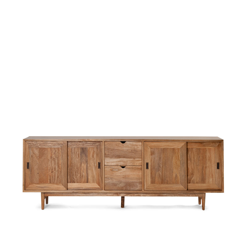 The Polo Sliding Door Buffet in Natural Sealed Mango Wood is defined by its clean geometry and understated detailing. Crafted from solid timber, it features two central drawers and four sliding doors, revealing internal shelving that offers generous, practical storage. Finished in a clean natural seal, the Polo brings warmth, depth and quiet sophistication to dining and living areas alike.