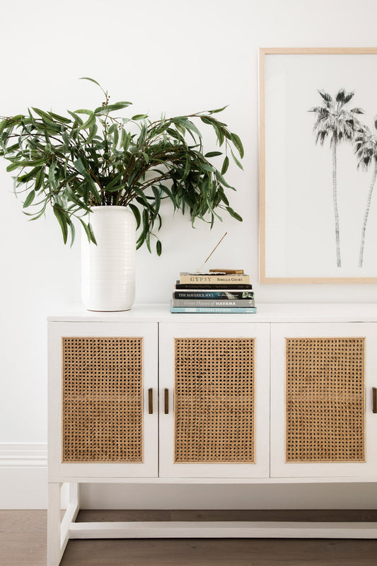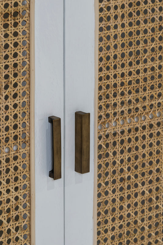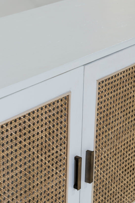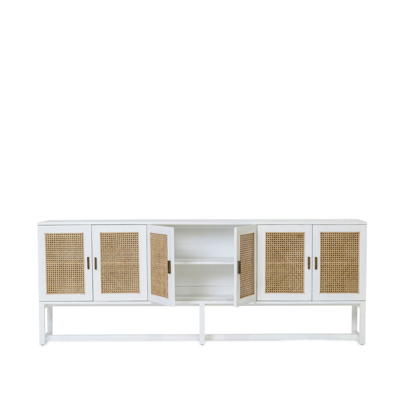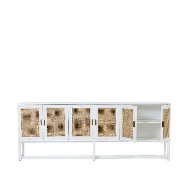 The Rita Buffet, built from solid mango wood in white finish. Featuring six doors with natural rattan inserts and solid brass handles.