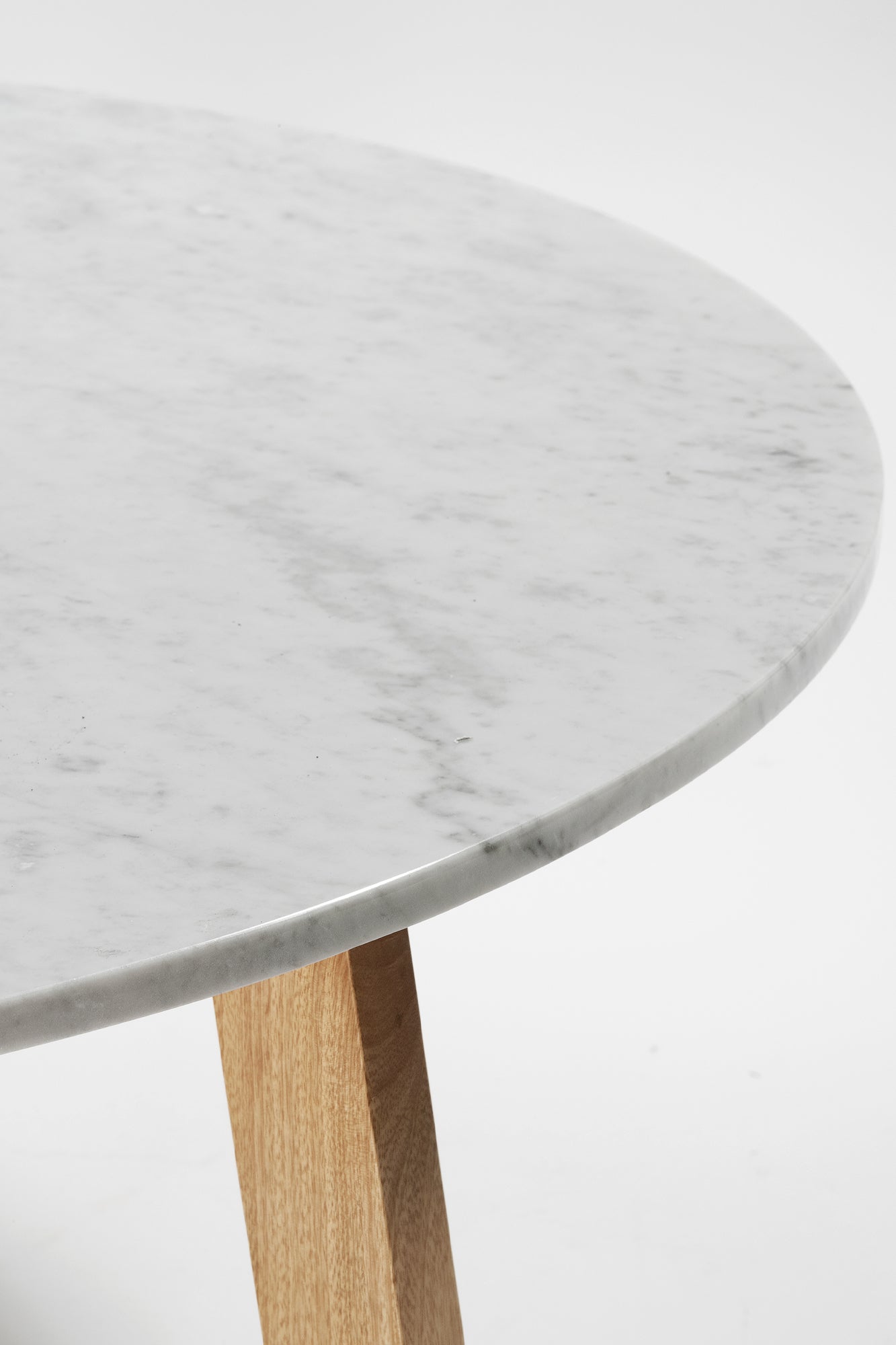 Constructed in sustainable mango wood with Natural Sealed finish. Solid Carrara White marble round top with angled leg base. Available with solid wood top or marble top.