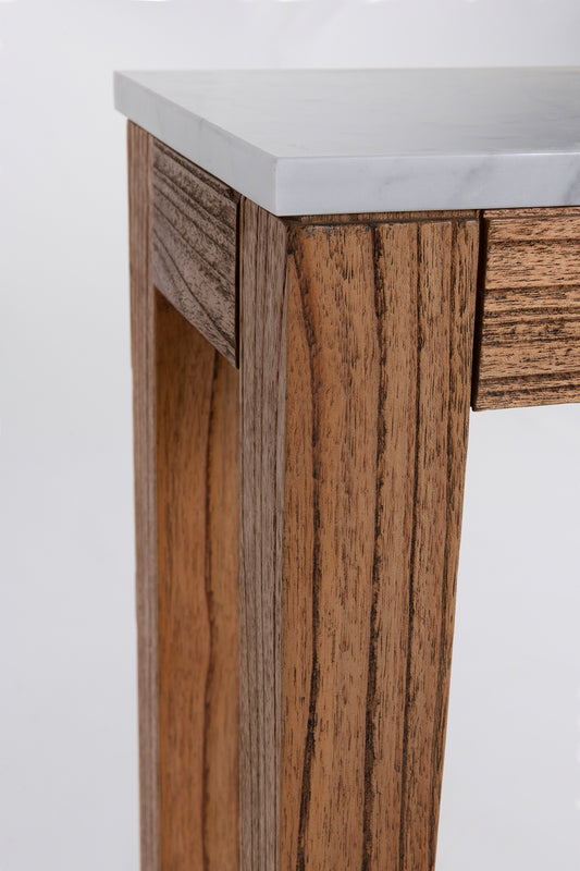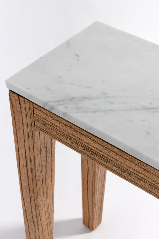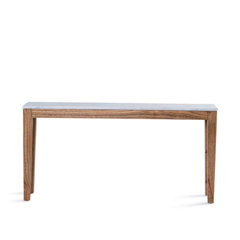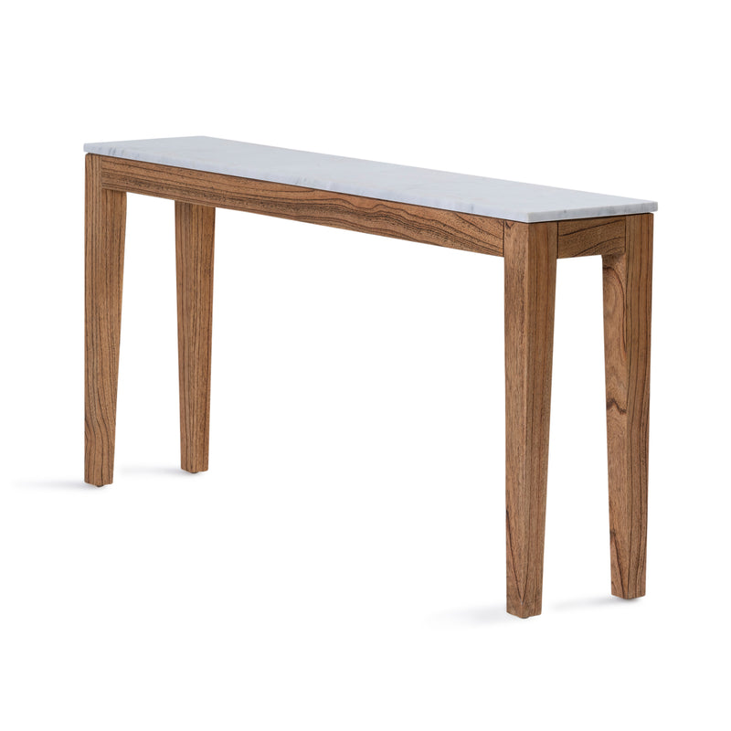 Built from mindi wood in antique mindi finish with white marble top. Compact and narrow, the Buddha console is versatile for any room. Available in four different lengths with solid wood top or a marble top.
