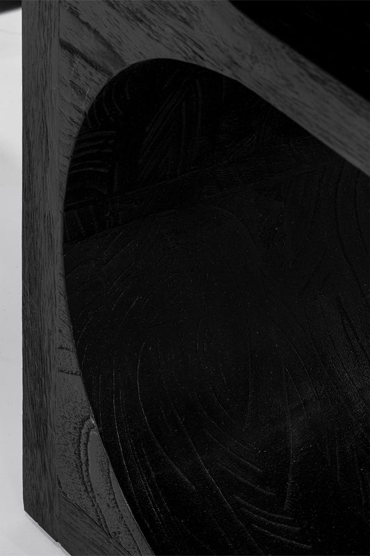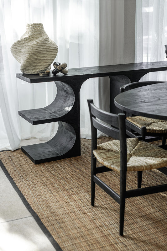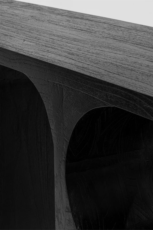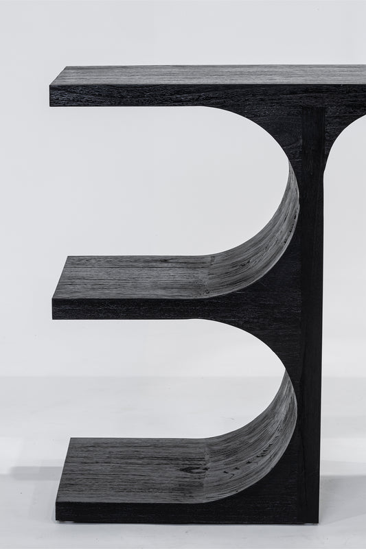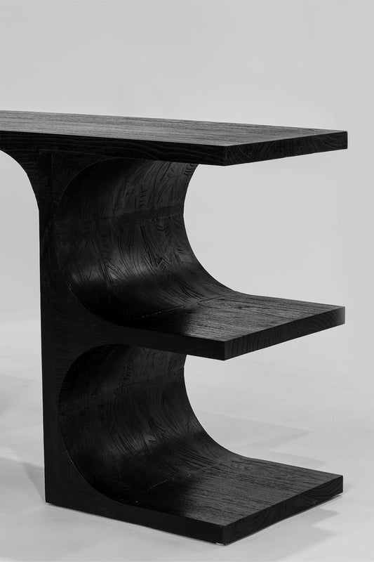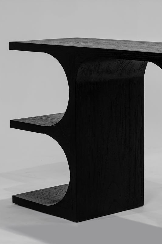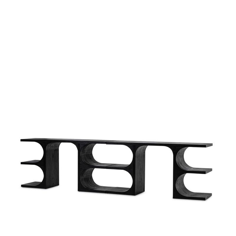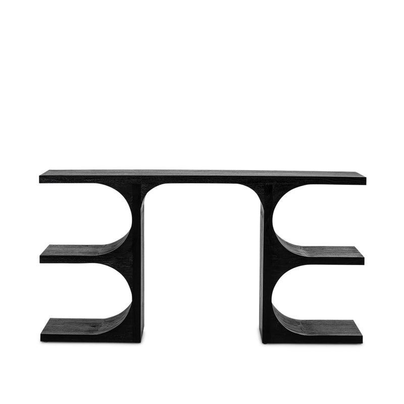 The Elissa Shelving Console, a statement piece featuring a combination of linear and curved cut out arches. Crafted from solid mango wood in black finish, it can be used as a single console or desk or be joined together to make a shelving unit perfect for all your storage and decor needs.