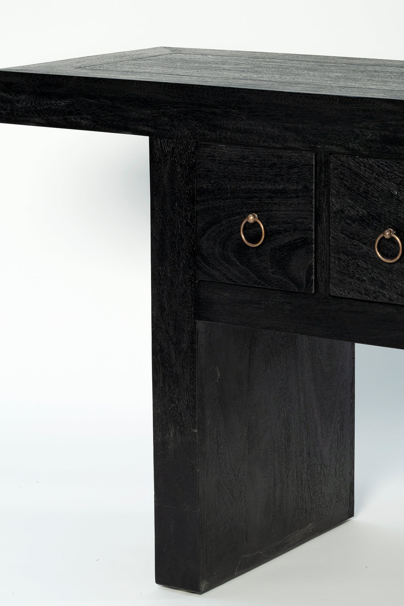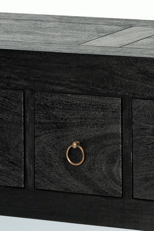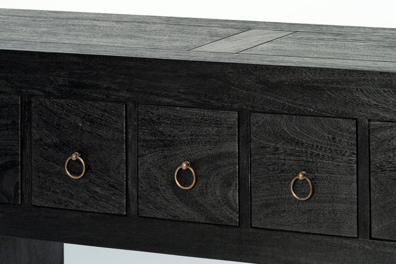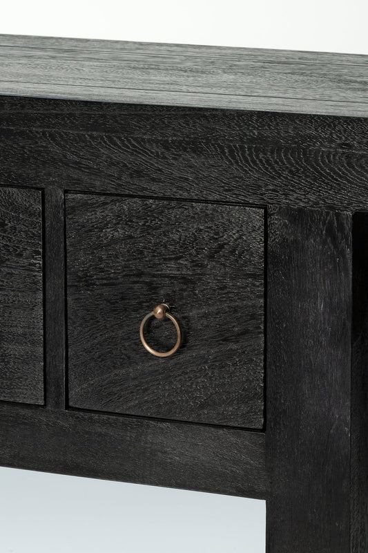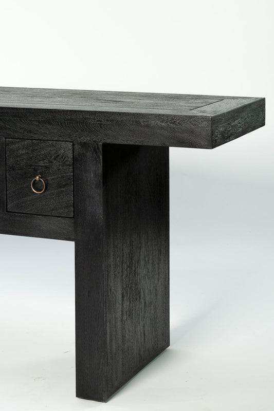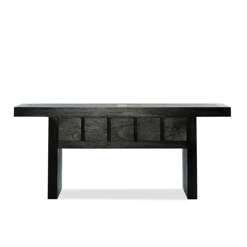 The Shanghai Console 5 Drawer is a refined statement in solid timber, defined by its strong architectural frame and generous overhanging top. It features five drawers, each finished with a simple ring pull that adds subtle detail without distraction. Offering practical storage, the Shanghai Black Console Table maintains a composed, sculptural presence in an entry, hallway or living space.