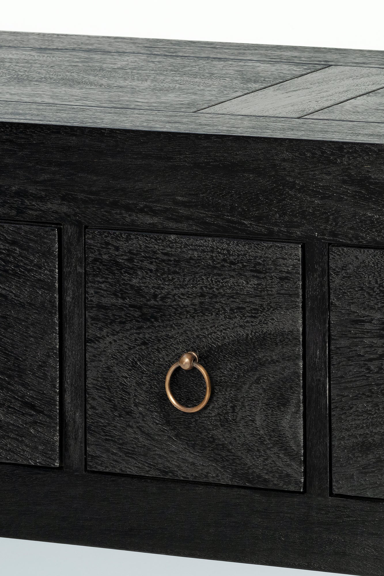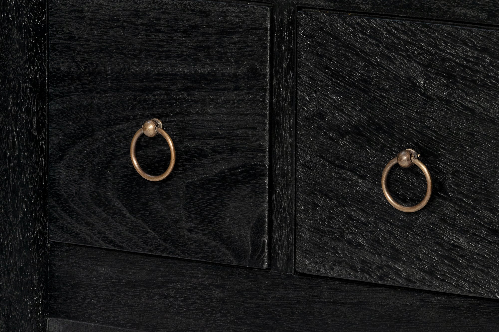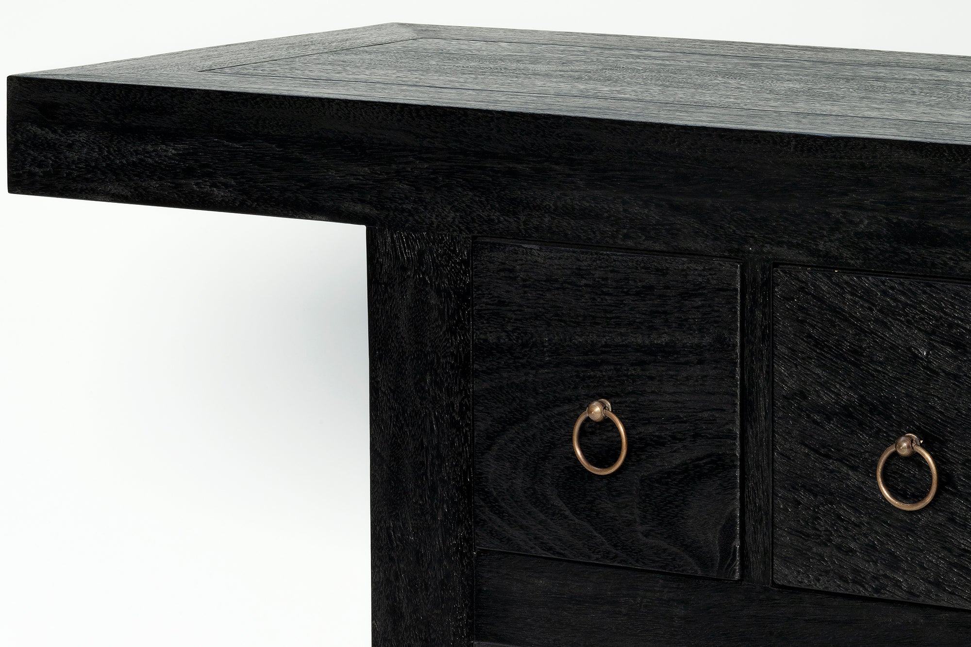 The Shanghai Console 5 Drawer is a refined statement in solid timber, defined by its strong architectural frame and generous overhanging top. It features five drawers, each finished with a simple ring pull that adds subtle detail without distraction. Offering practical storage, the Shanghai Black Console Table maintains a composed, sculptural presence in an entry, hallway or living space.