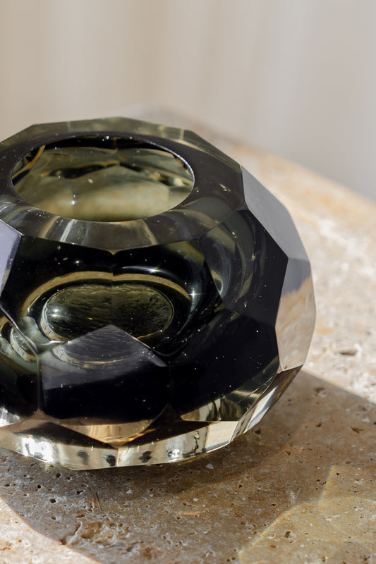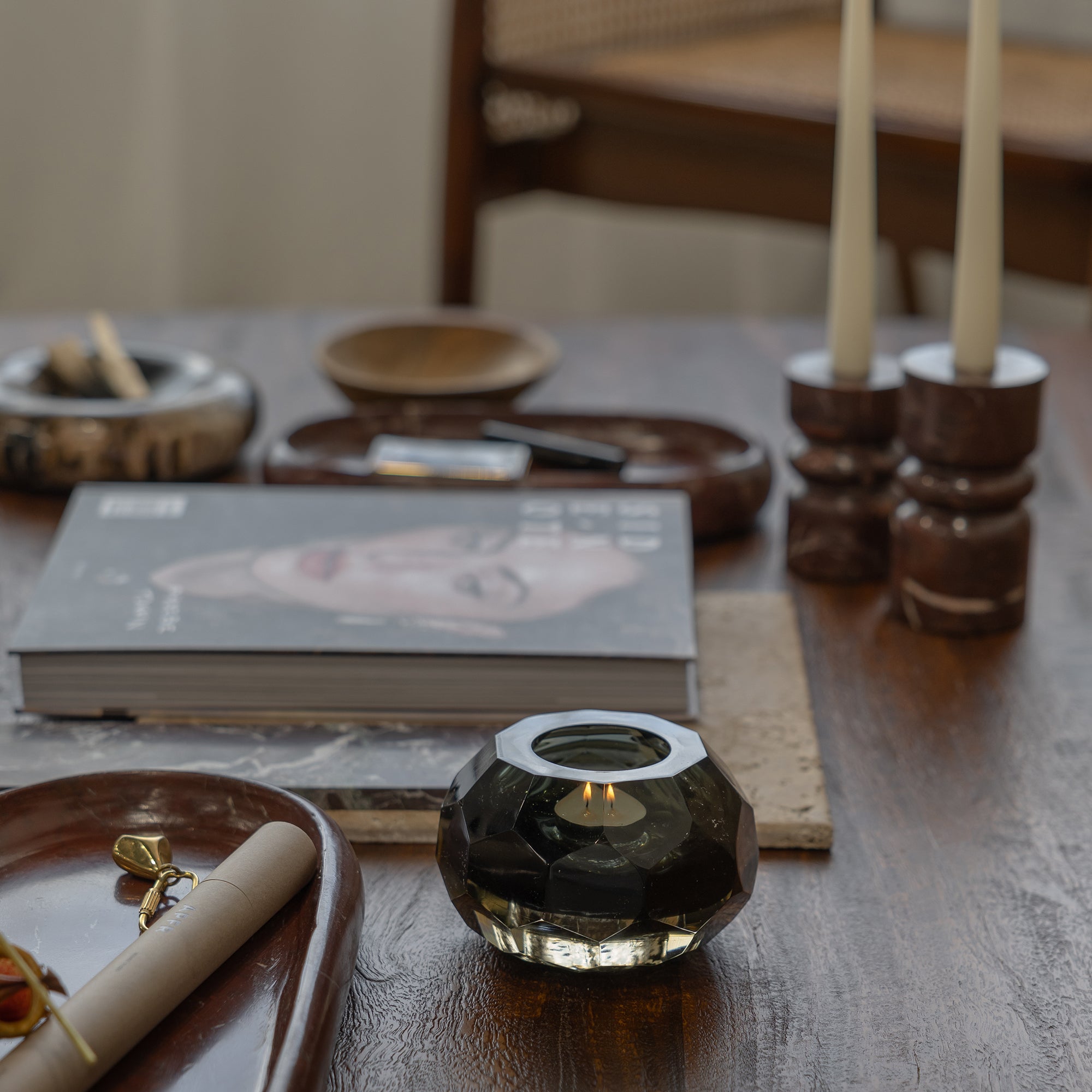 A striking accent for shelves, tables or bedside styling, the Avisa Pania Votive in Grey brings a refined, moody elegance to any space. Featuring a bold, faceted form and translucent grey tone, it captures and refracts candlelight for a soft, atmospheric glow. Perfect styled as a standalone piece or layered with other votives, it adds warmth and visual interest with ease.