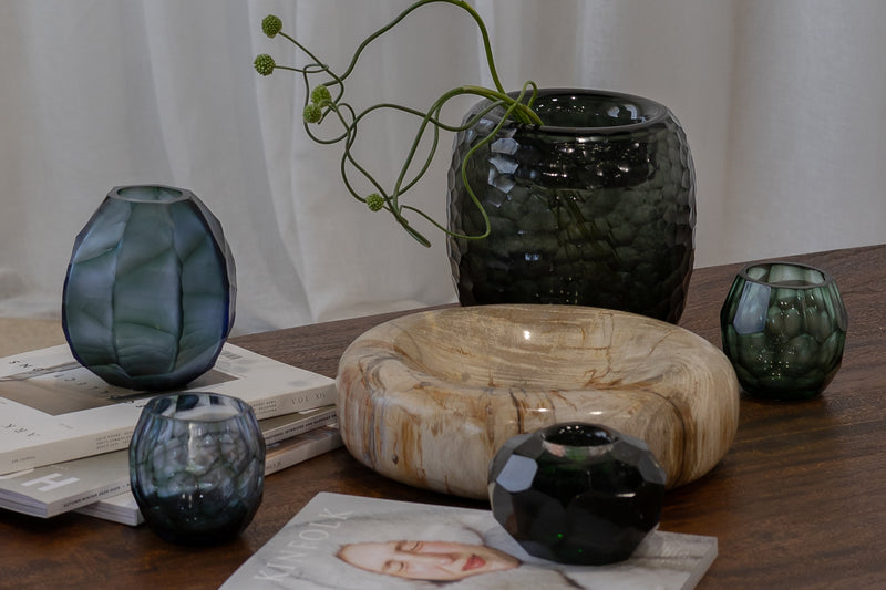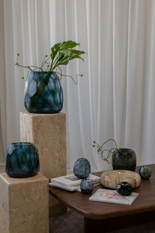 A refined accent for shelves, tables or bedside styling, the Avisa Selkie Votive in Blue brings a soft wash of colour and light to any space. Featuring a gently faceted silhouette and translucent blue tone, it adds depth and visual interest while allowing candlelight to glow beautifully through. Perfect as a standalone piece or styled in a cluster, it offers an effortless way to introduce warmth and atmosphere.