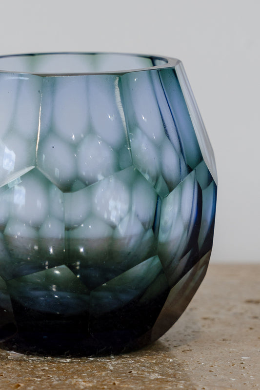 - Faceted glass form with softly rounded edges