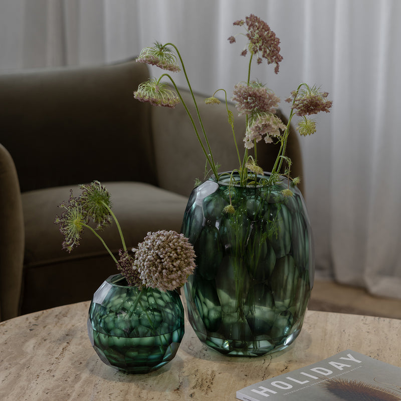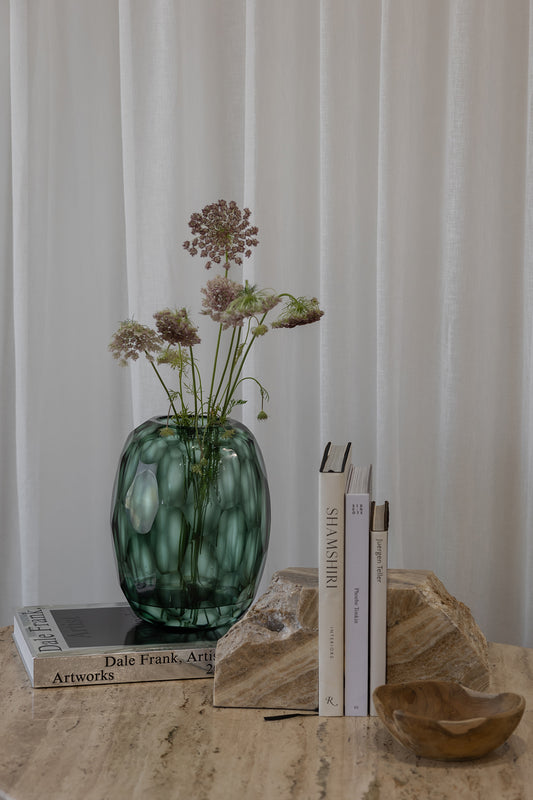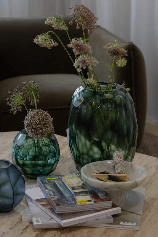 A statement piece for consoles, dining tables or open shelving, the Avisa Sirena Vase in Aqua brings sculptural presence and luminous colour to any interior. Featuring a tall, faceted silhouette and translucent aqua tone, it beautifully captures and reflects light, creating depth and movement within the glass. Striking styled alone or filled with stems, it offers an elevated way to introduce colour and artistry into your space.