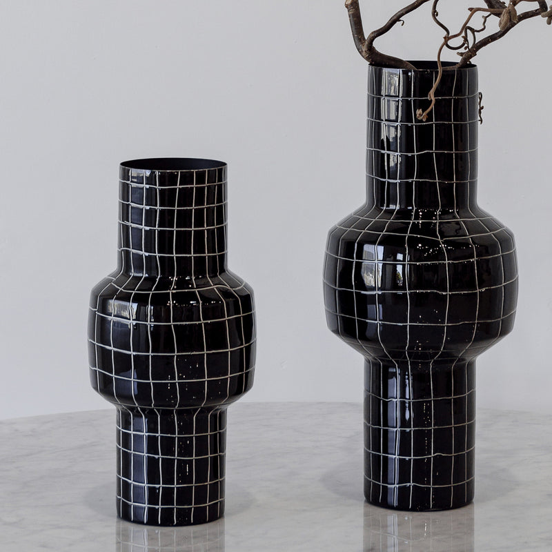 Crafted from iron, the Dahlia Vase features a sleek enamel finish with check pattern that adds a touch of elegance to any room. Elevate your home decor with this timeless piece.