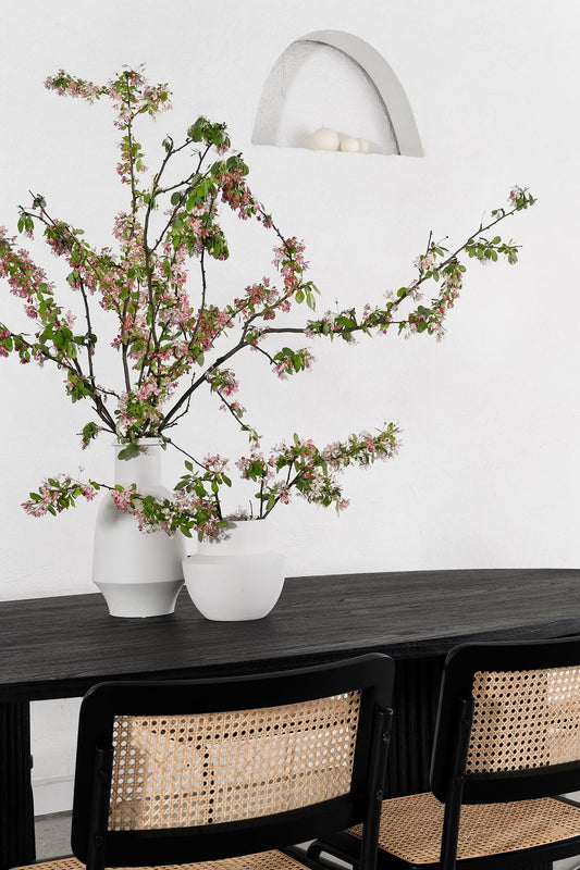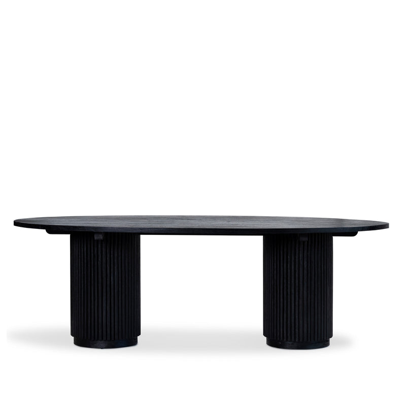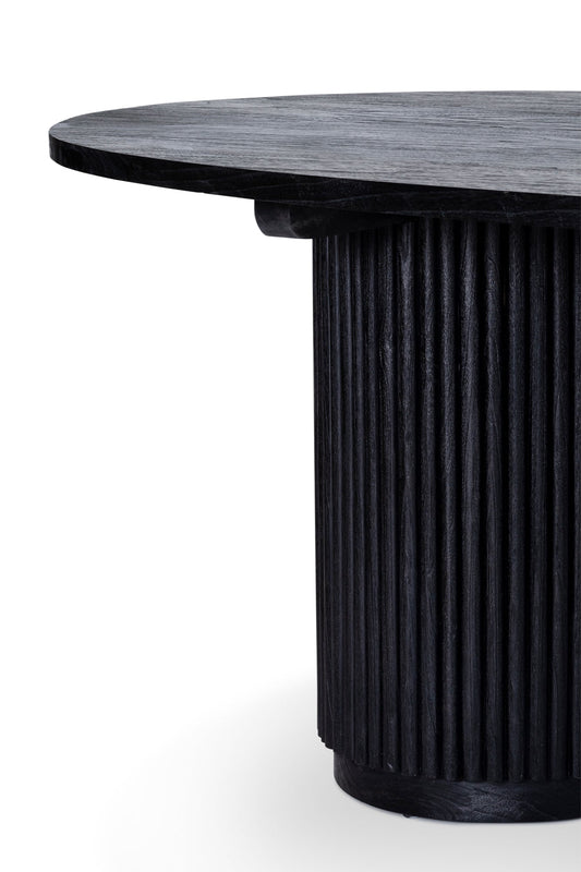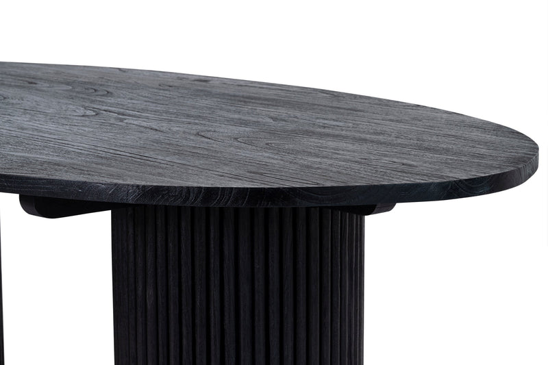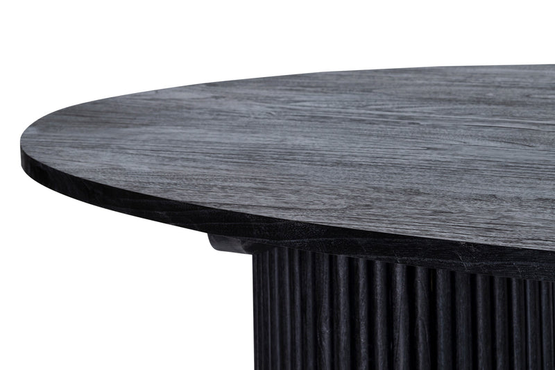 Built from solid mango wood with an antique finish. Oval shape top with two round ribbed pillars supporting each end.