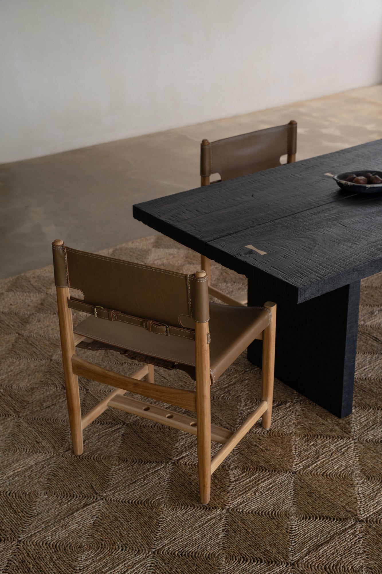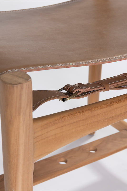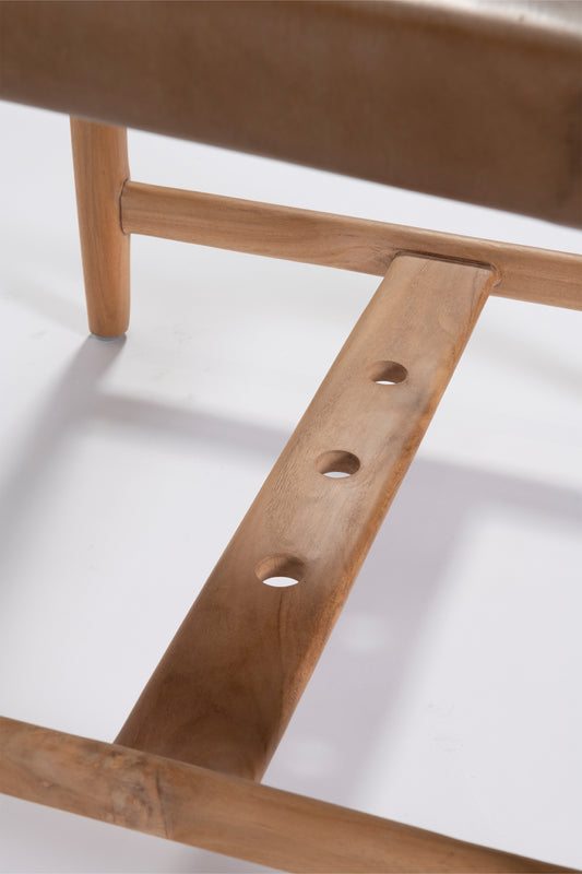 - Sustainability sourced teak hardwood frame with walnut leather back rest and seat.