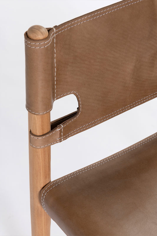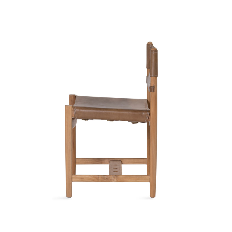 The Austin Side Chair is elegant, comfortable and practical. Featuring a tan leather backrest and seat with white hand stitched detail on a teak hardwood frame in a raw finish.