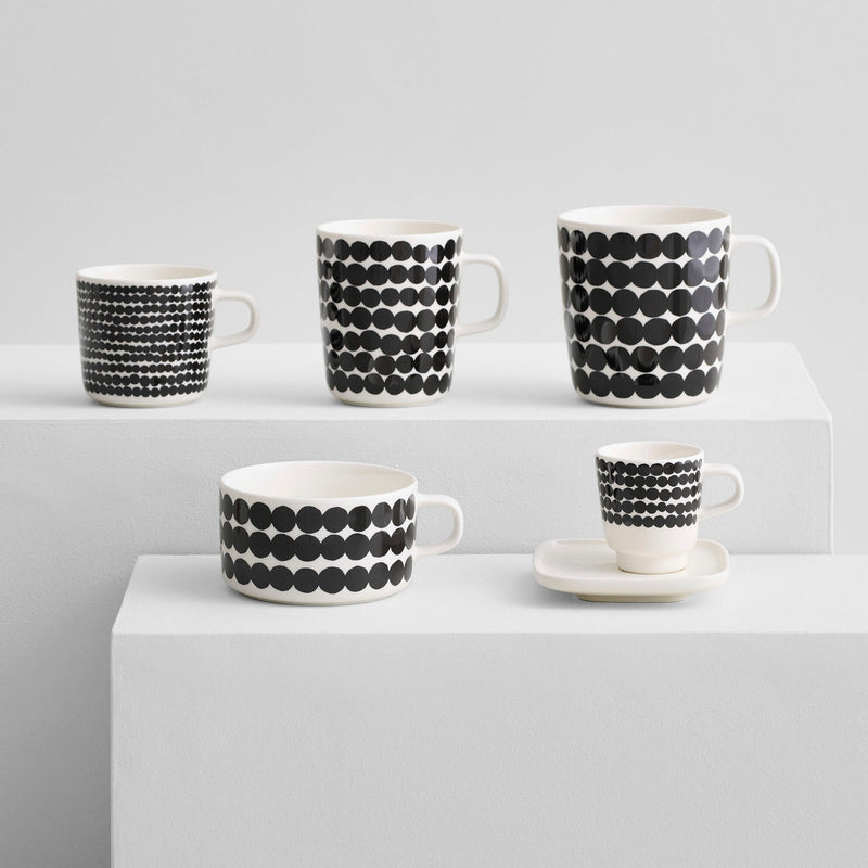 The Oiva Räsymatto Mug features the Räsymatto patterned design inspired by traditional rag rugs, bringing graphic character to everyday tea or coffee moments. Crafted from durable white stoneware, the mug is designed for daily use and stacks neatly, making it easy to mix and match with coordinating tableware.