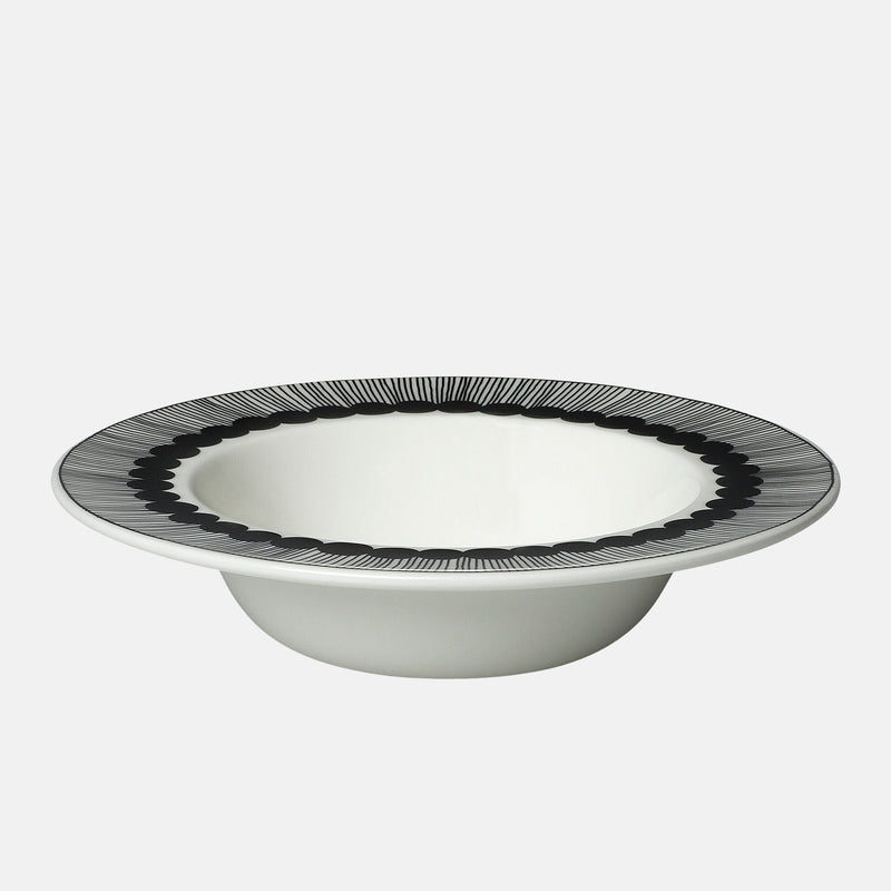 The Oiva Siirtolapuutarha Deep Plate – Black/White features the Oiva patterned design inspired by flourishing city gardens, bringing graphic interest to the table. Crafted from durable white stoneware, its deeper form makes it ideal for soups, pasta and everyday meals.