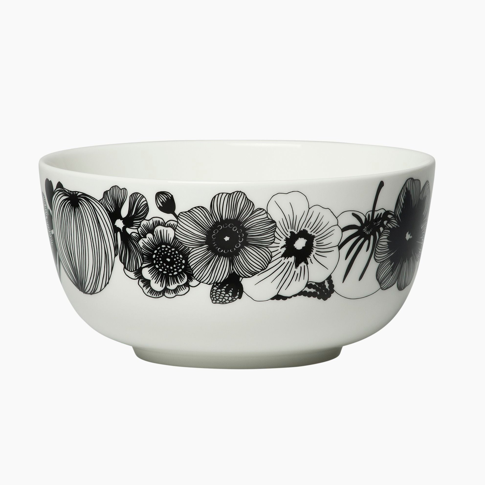 The Oiva Siirtolapuutarha Bowl features the Siirtolapuutarha patterned design inspired by flourishing city gardens, bringing graphic interest to the table. Crafted from durable white stoneware, its generous size makes it ideal for serving noodles, salads and shared dishes.