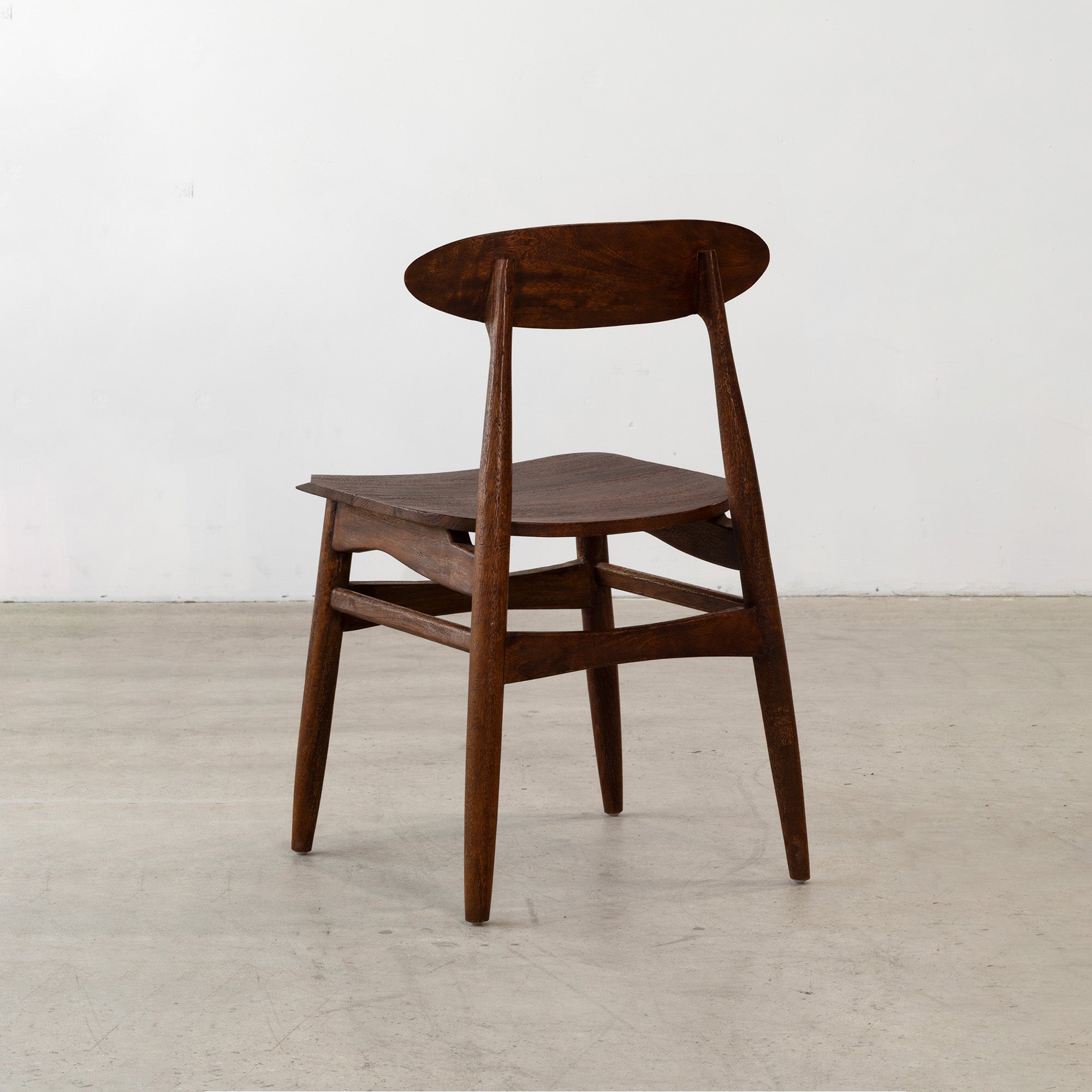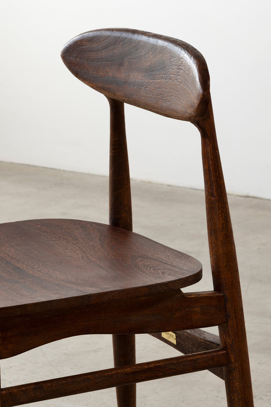 The Tango Chair is a considered study in proportion and form, defined by its gently curved backrest and softly contoured seat. Crafted from solid timber, its tapered legs and supportive stretchers create a balanced, architectural silhouette that lends quiet structure and refinement to dining, study or living spaces.