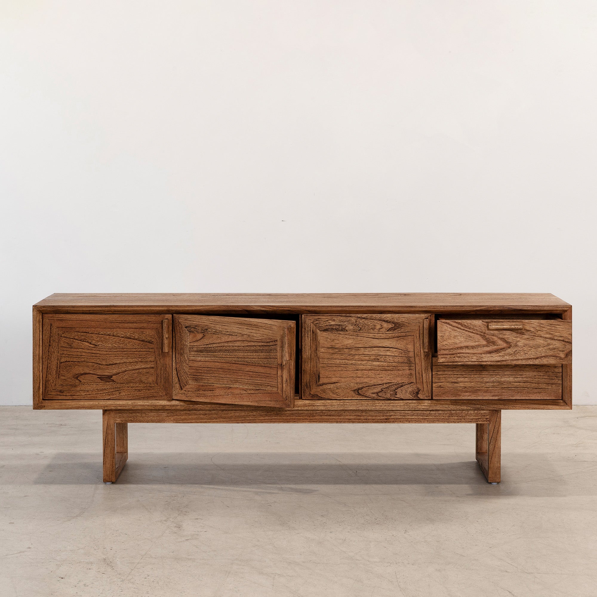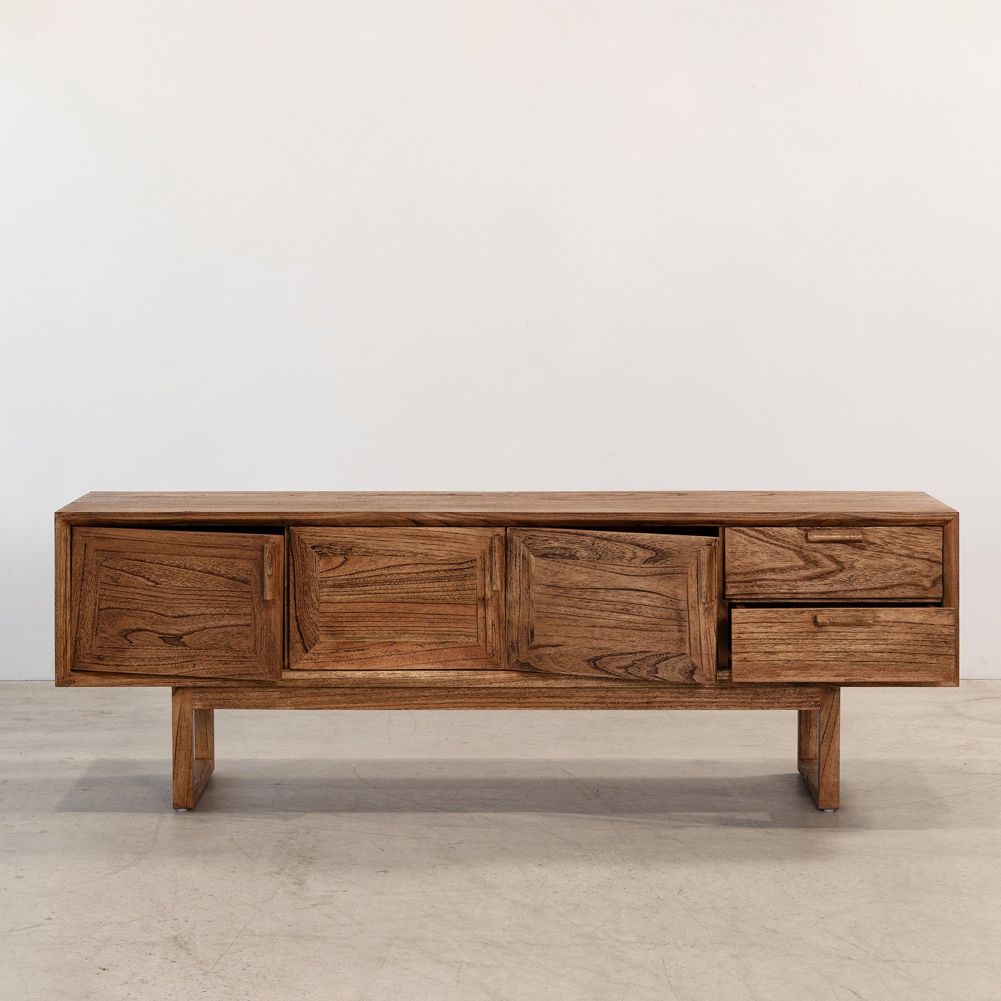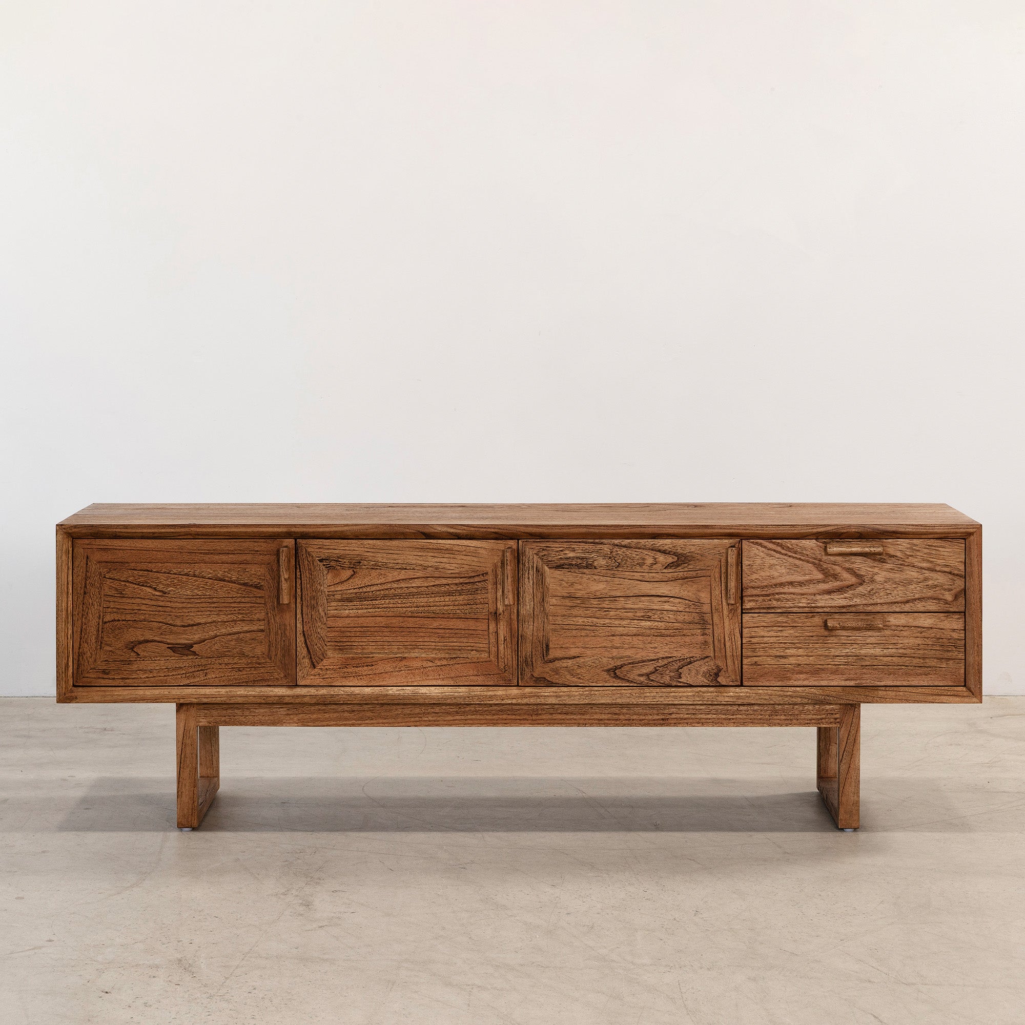 The Enzo Entertainment Unit is a refined expression of solid timber, defined by clean lines and bold, framed door fronts. Three cupboard doors and two drawers provide generous concealed storage, maintaining a streamlined façade. Elevated on a structured base, it brings warmth and quiet structure to living spaces.