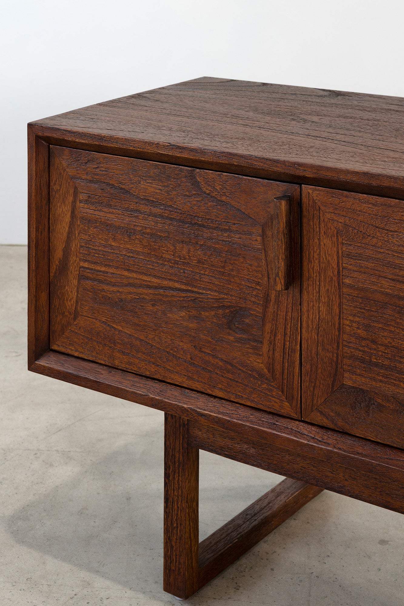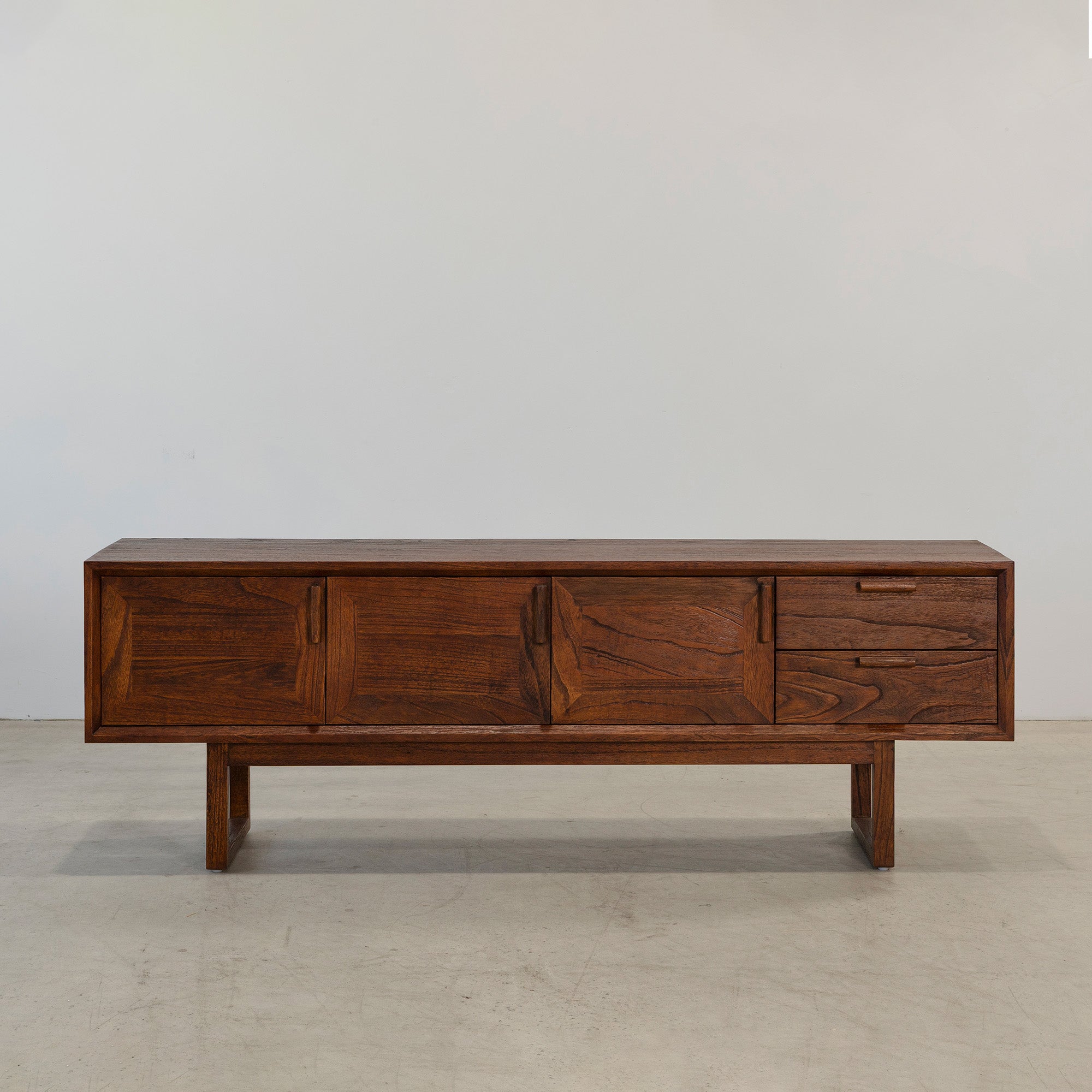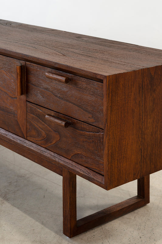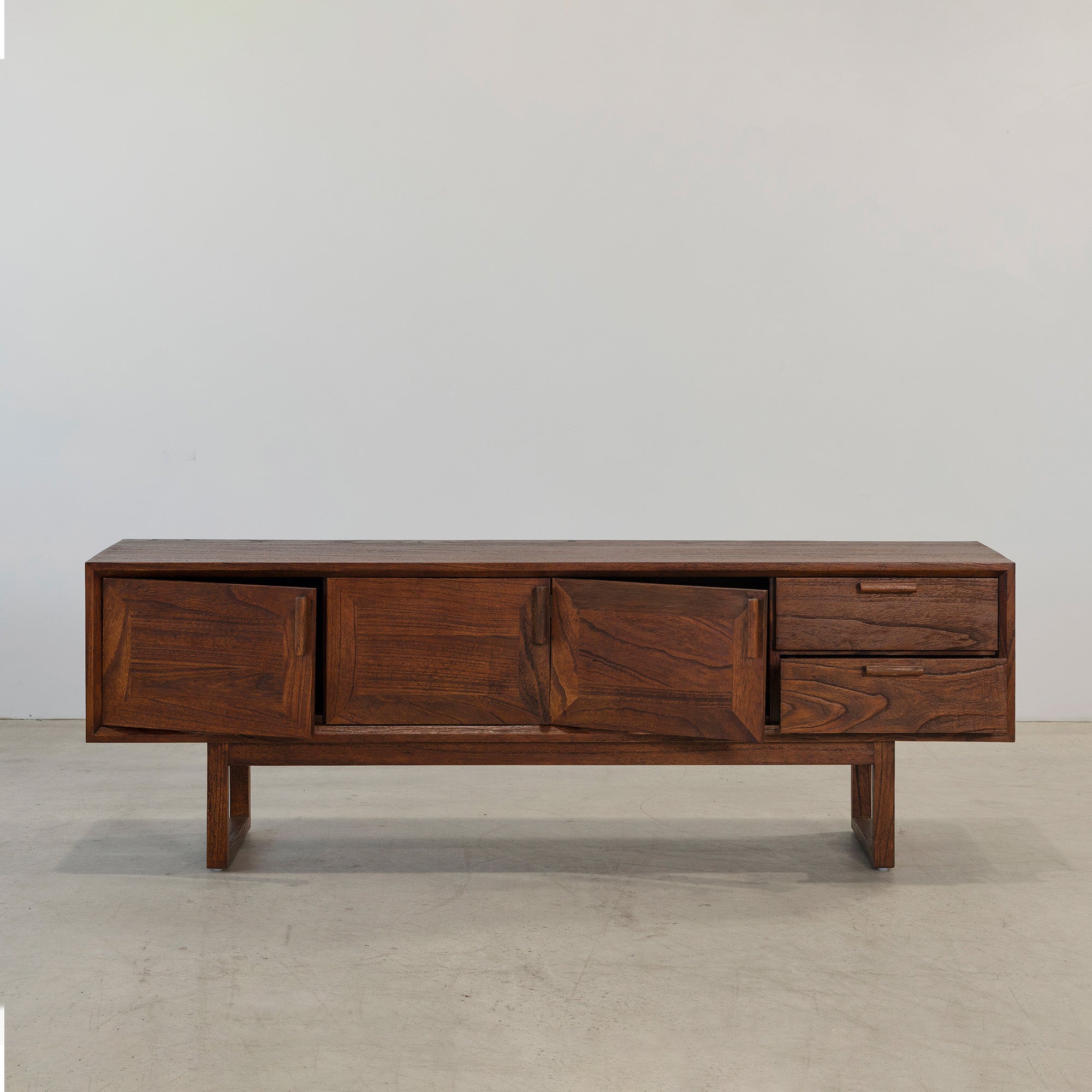 The Enzo Entertainment Unit is a refined expression of solid timber, defined by clean lines and bold, framed door fronts. Three cupboard doors and two drawers provide generous concealed storage, maintaining a streamlined façade. Elevated on a structured base, it brings warmth and quiet structure to living spaces.