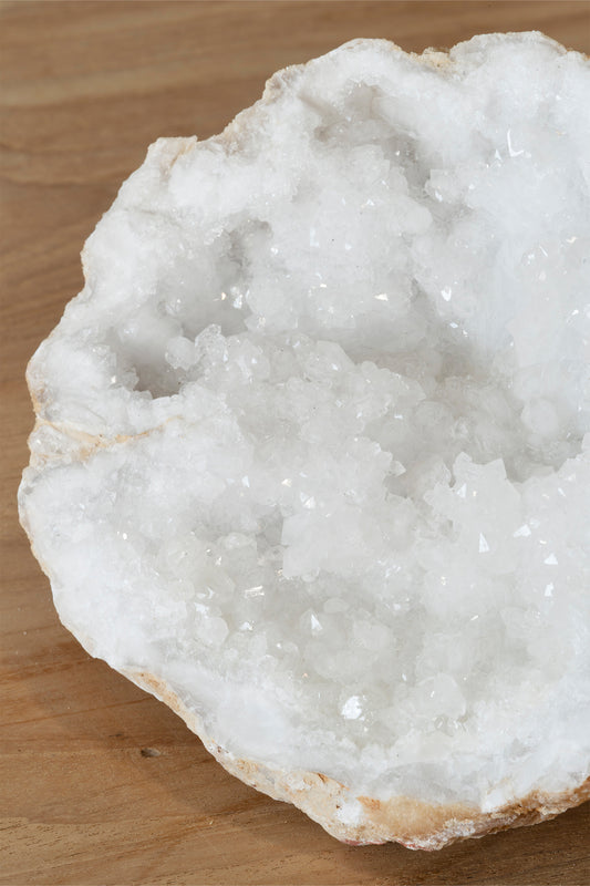 A striking display of natural beauty, this quartz geode features a raw outer shell and crystal-lined interior. Each piece is one-of-a-kind, adding subtle texture and light to any surface. Style solo on a shelf, coffee table or beside your bed for a refined, organic touch.