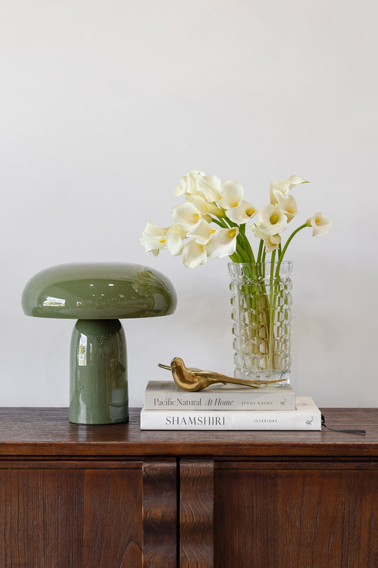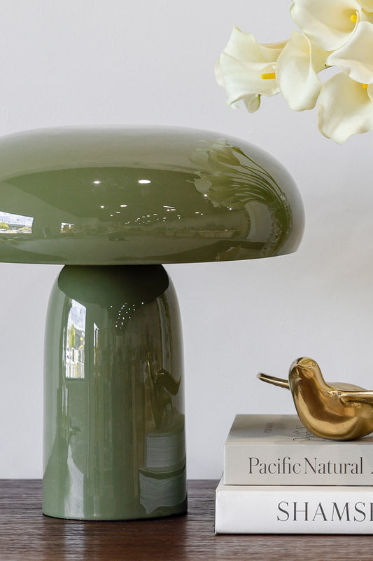 A refined statement piece, the Alain table lamp features a softly rounded dome shade paired with a sculptural cylindrical base, finished in a glossy Olive glaze. Its balanced proportions and organic silhouette create a modern yet timeless aesthetic, adding warmth and character to any interior.